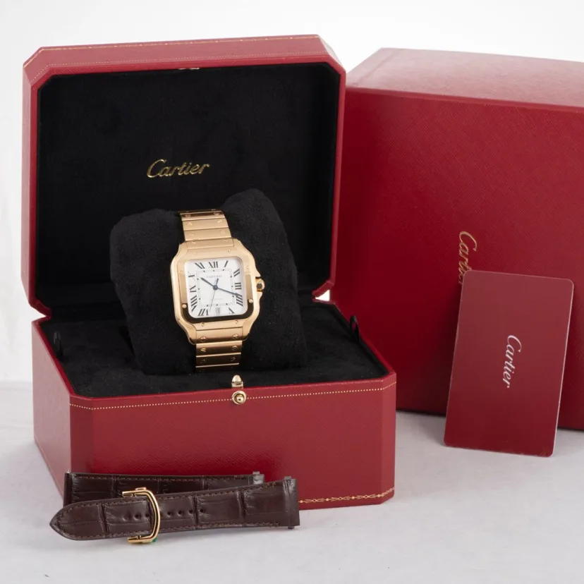 Santos watch, medium model, mechanical movement with automatic winding, calibre 1847 MC. 18K yellow gold case, 18K yellow gold 7-sided crown set with a faceted sapphire, silvered opaline dial, blued-steel sword-shaped hands, sapphire crystal. 18K yellow gold bracelet with “SmartLink” adjustment system. Second bracelet in alligator skin, with interchangeable 18K yellow gold folding buckle. Both bracelets are fitted with the “QuickSwitch” interchangeability system. Case width: 35.1 mm, thickness: 8.83 mm. Water-resistant to 10 bar (approx. 100 metres).