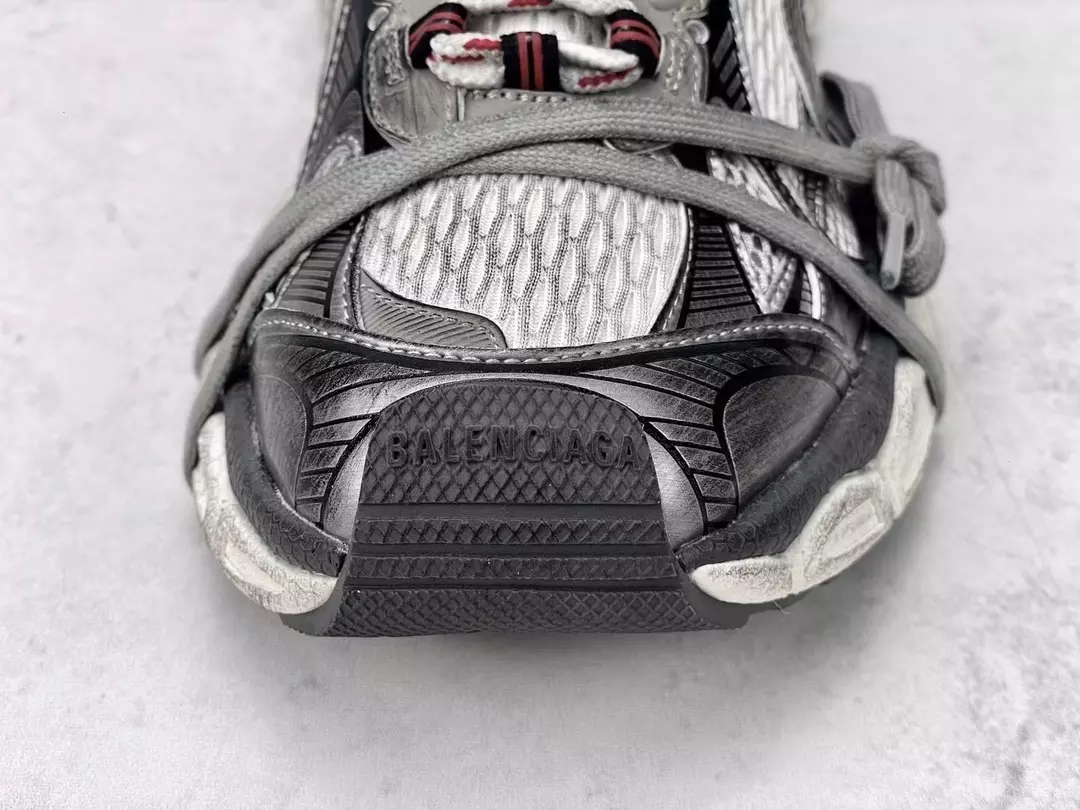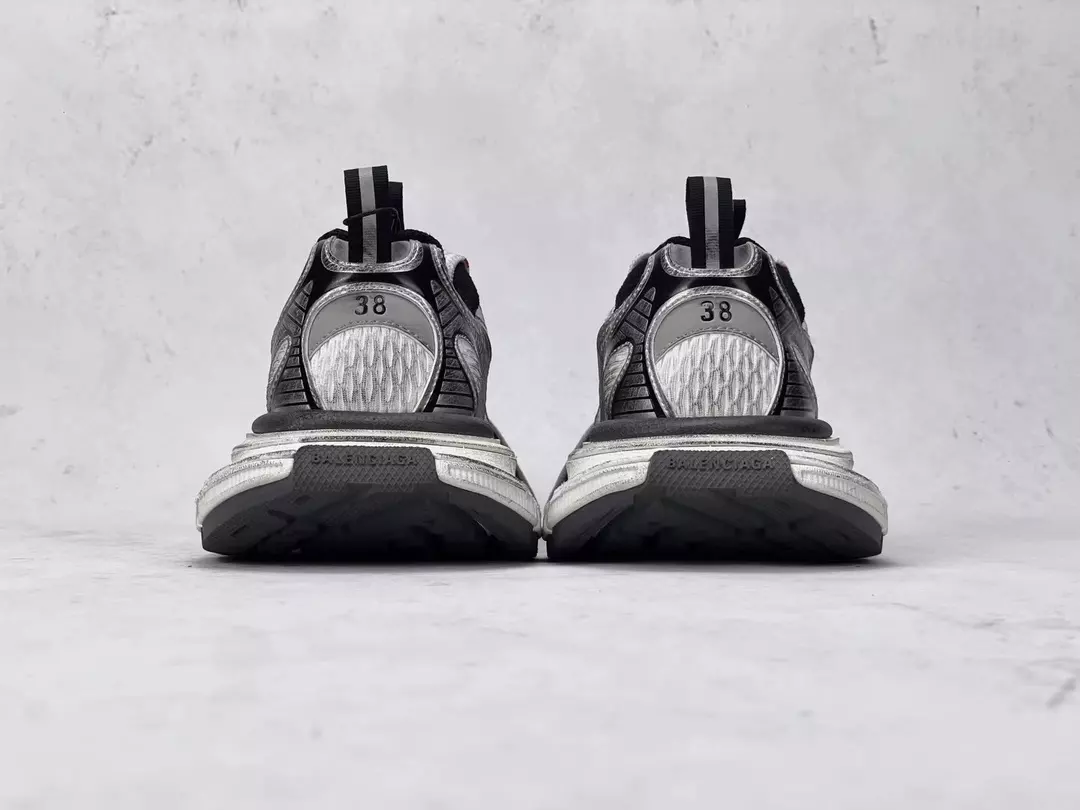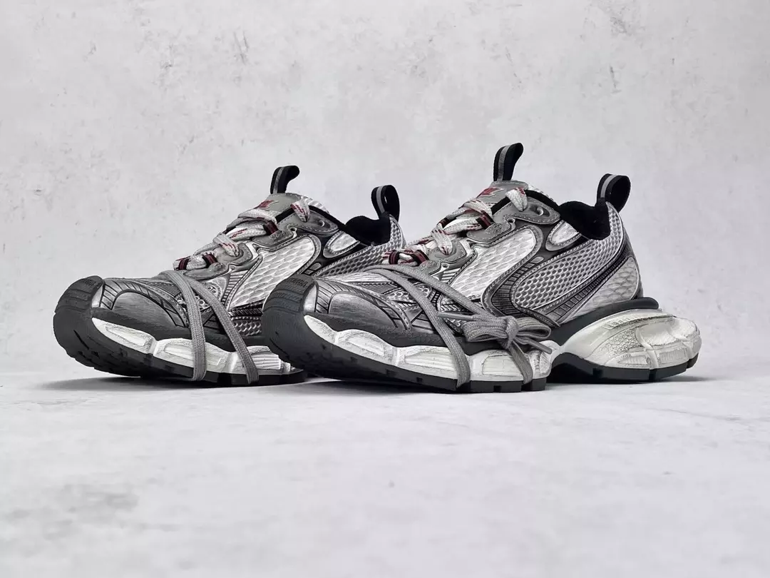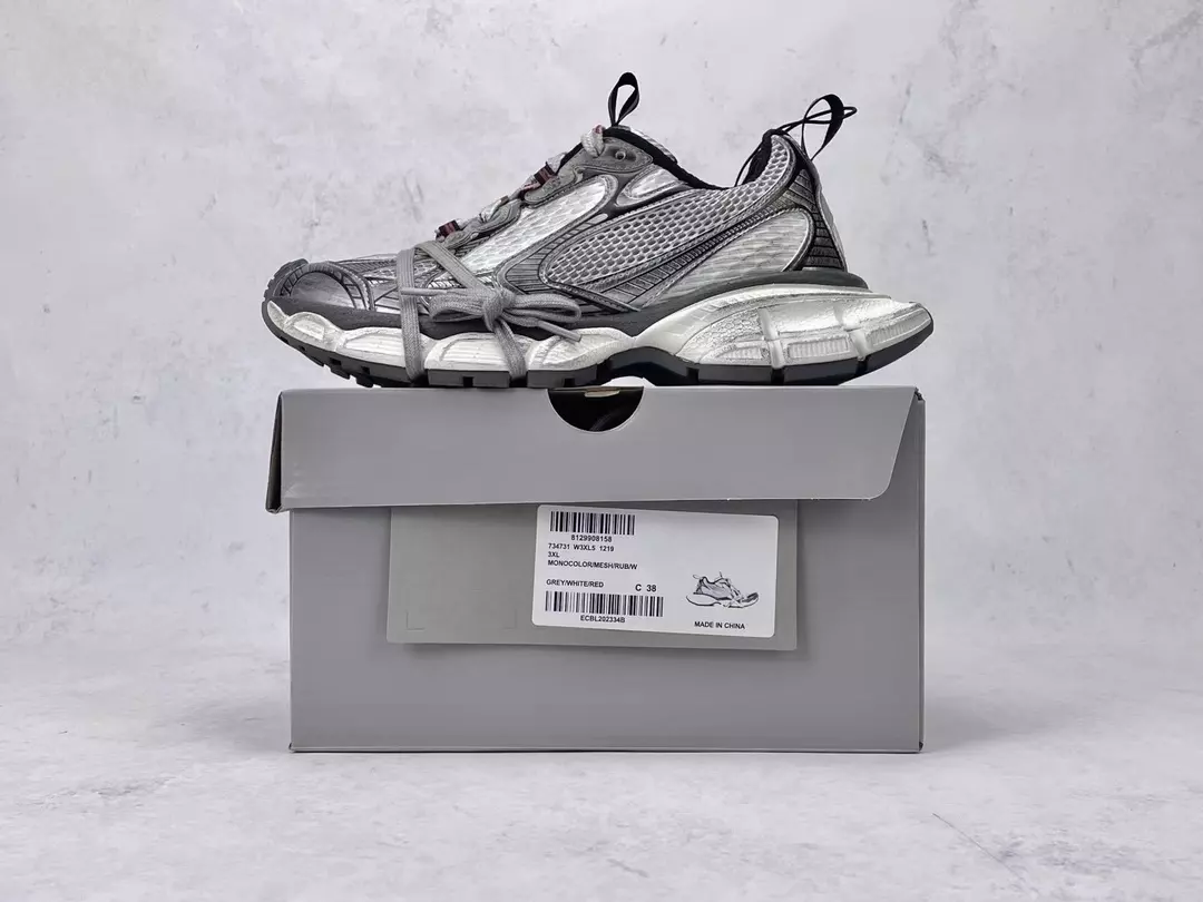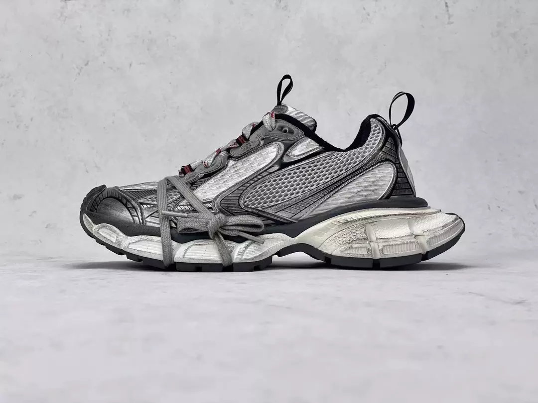 The Balenciaga 3XL Sneaker offers a unique blend of style and comfort. Crafted from a combination of mesh and polyurethane. it features a worn-out effect for a distinctive look. The Balenciaga logo is prominently displayed at the edge of the toe and at the back. adding a touch of brand identity. Additionally. the size is embossed on the upper and at the back of the heel for added detail. One of the standout features is the 3XL rubber branding on the tongue. which includes reflective detailing for added visibility. The sneaker also comes equipped with a back pull-on tab and a tongue pull-on tab. both featuring reflective elements.