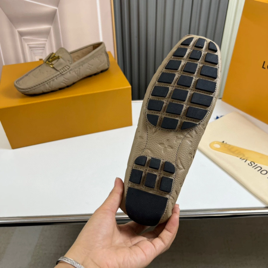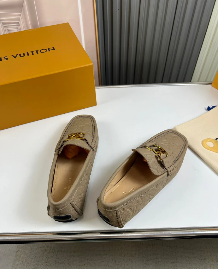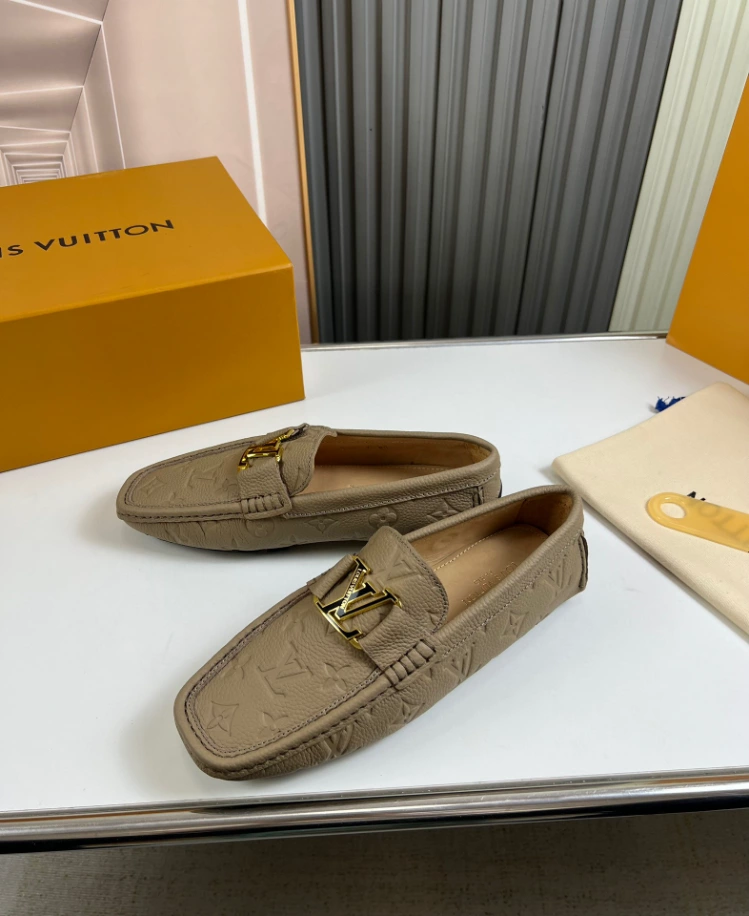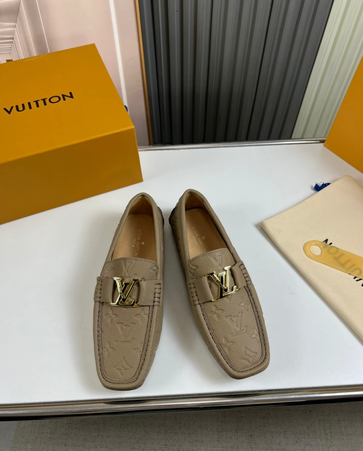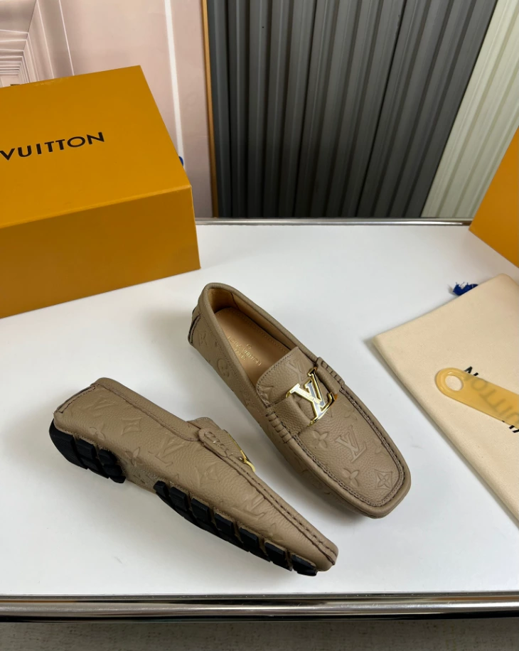 LV Monte Carlo Moccasin – Louis Vuitton's iconic grained Taiga calf leather. this version of the timeless Monte Carlo moccasin features a tubular construction without an insole. ensuring lightness and suppleness. The hand-stitched vamp is adorned with an LV Initials accessory. while the flexible outsole includes rubber pads solely at the front and back.
