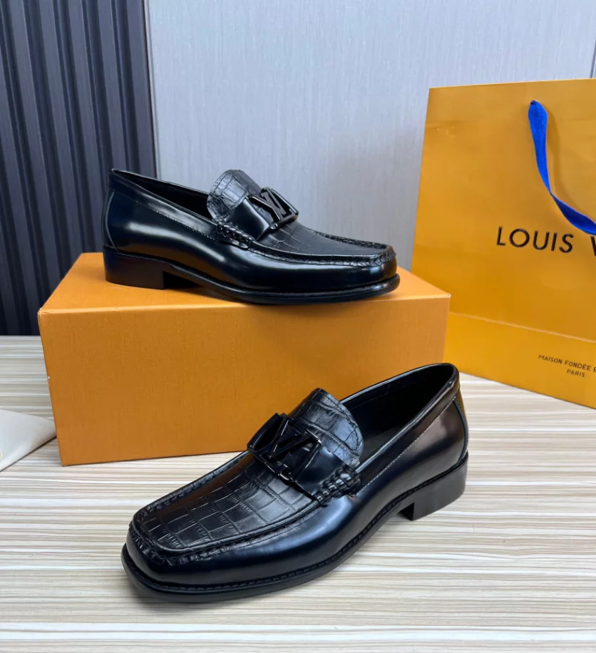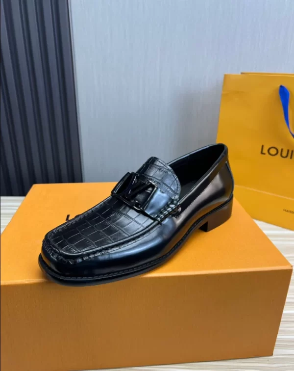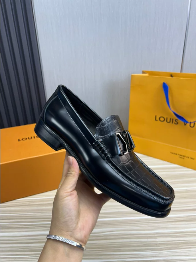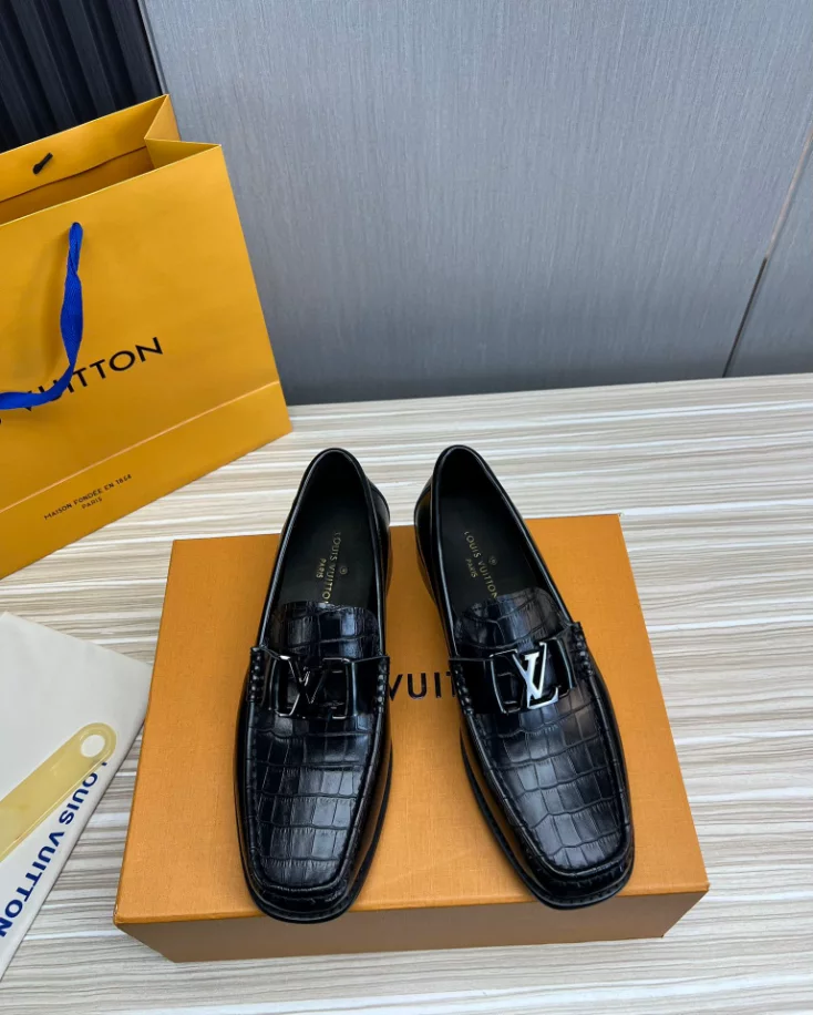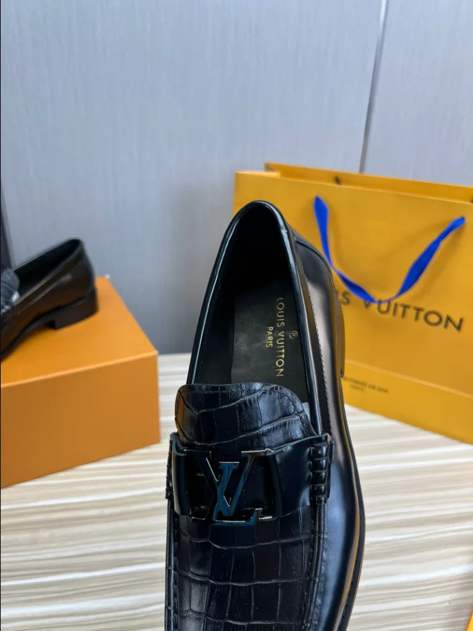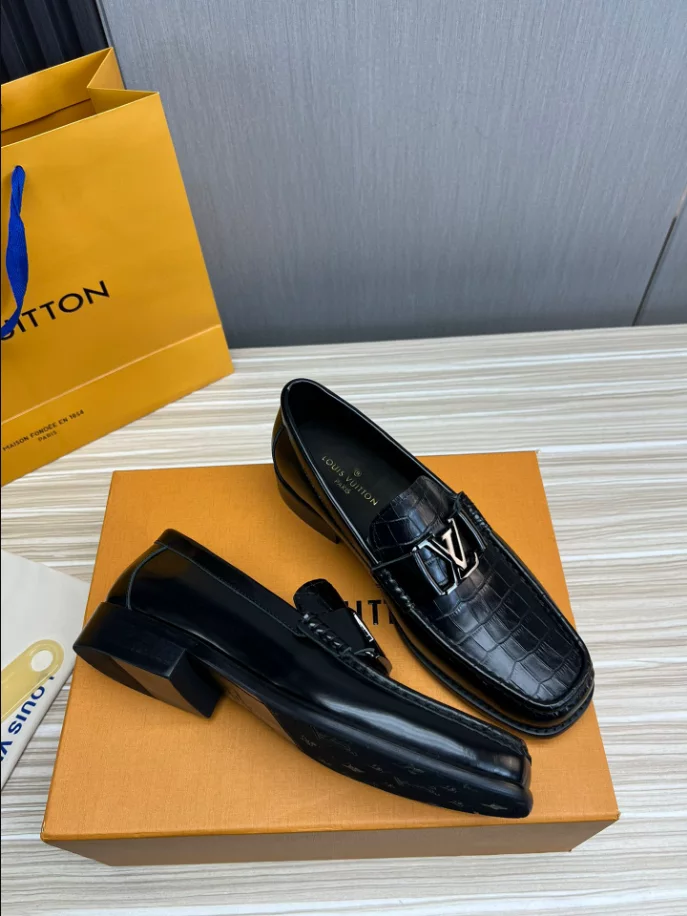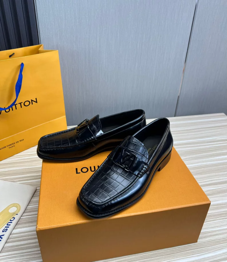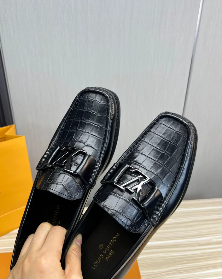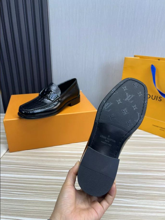 LV Montaigne Loafer crafted from premium waxed calf leather. showcasing refinement and luxury. Designed with a Blake construction and intricate hand-stitched details on the vamp and hand-painted edges. The standout feature is the LV initials accessory in antique gold finish. The leather outsole ensures durability and comfort. making it a perfect choice for modern fashion enthusiasts.