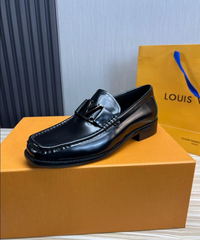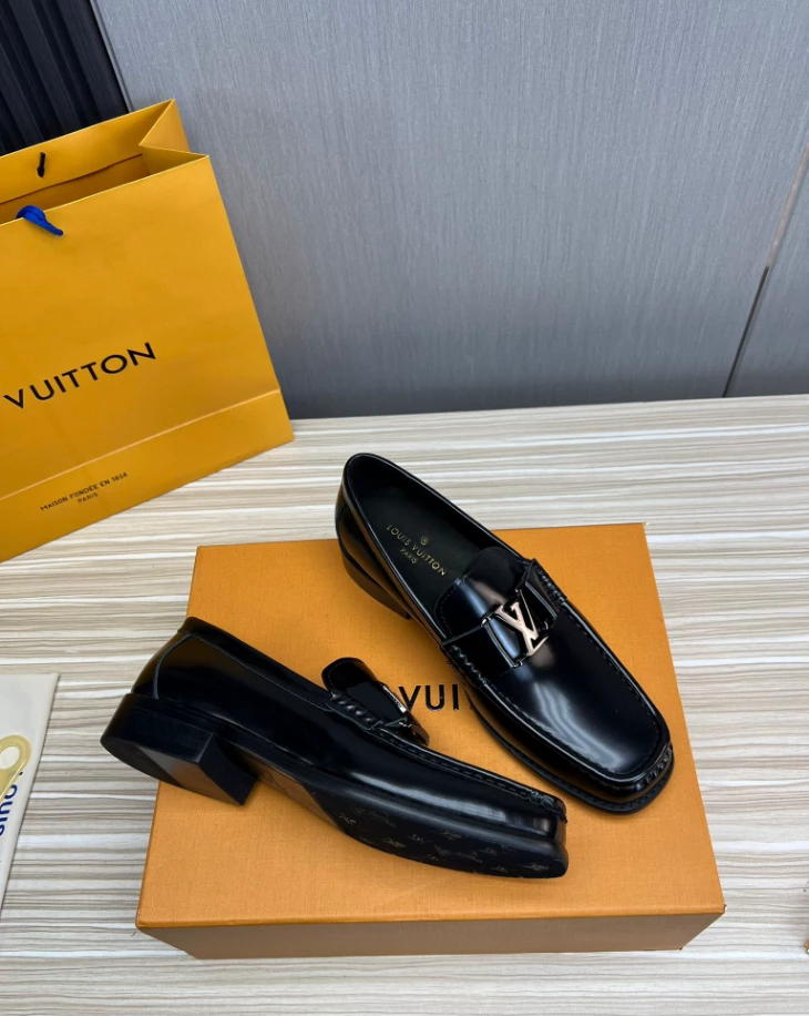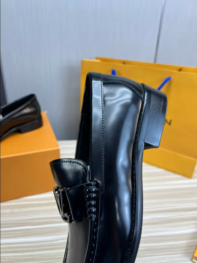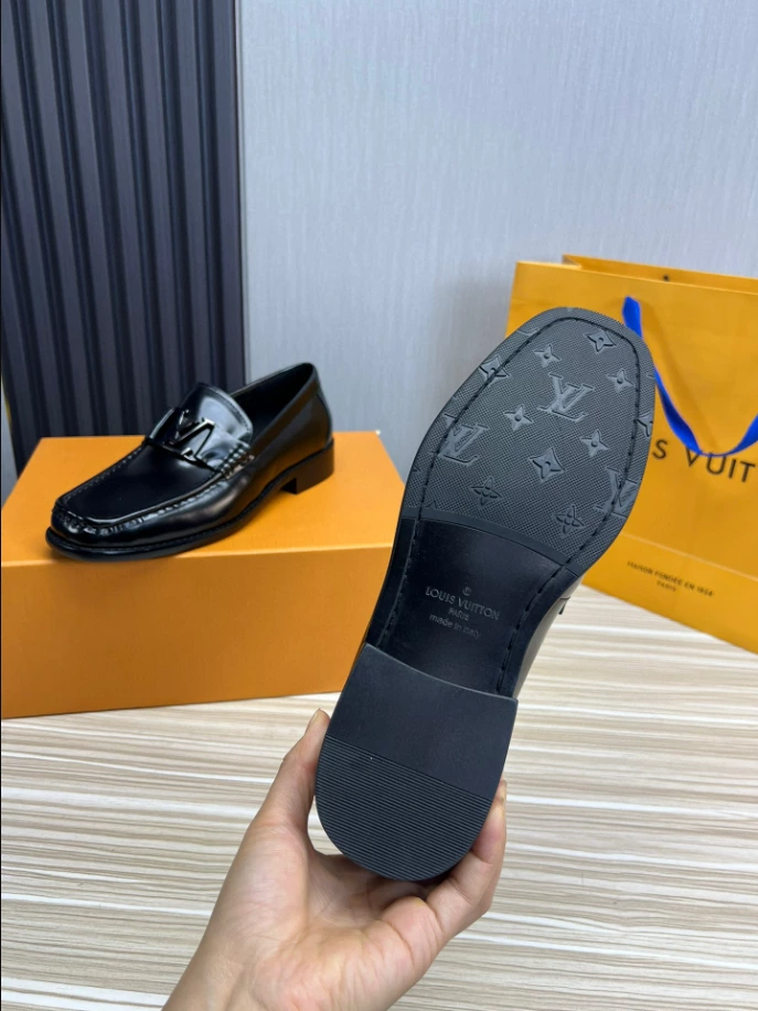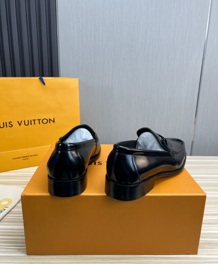 LV Montaigne Loafer crafted from premium waxed calf leather. showcasing refinement and luxury. Designed with a Blake construction and intricate hand-stitched details on the vamp and hand-painted edges. The standout feature is the LV initials accessory in antique gold finish. The leather outsole ensures durability and comfort. making it a perfect choice for modern fashion enthusiasts.