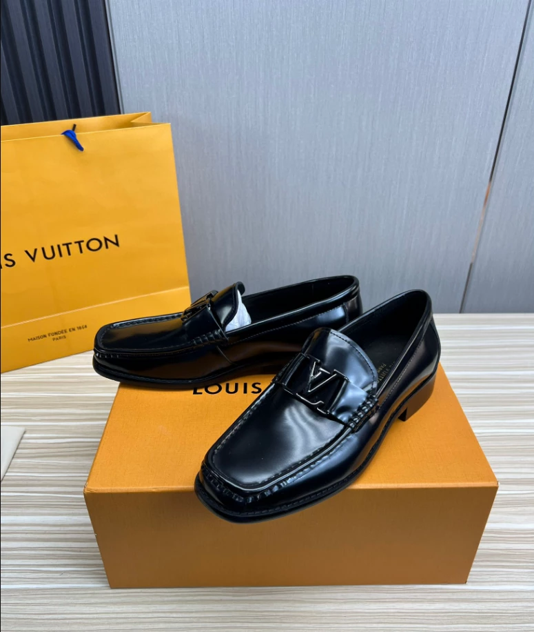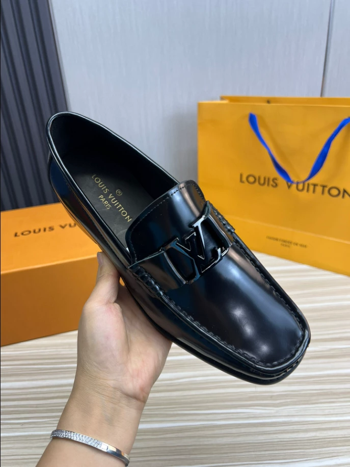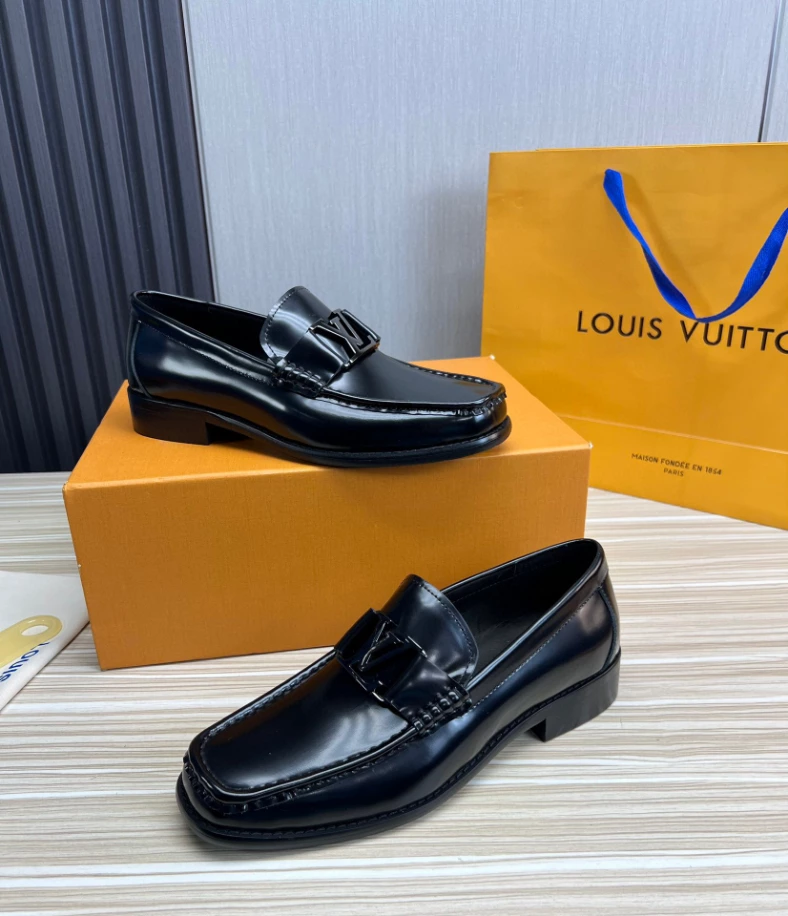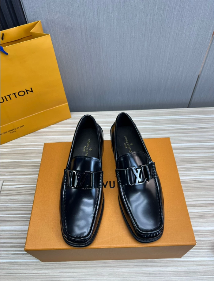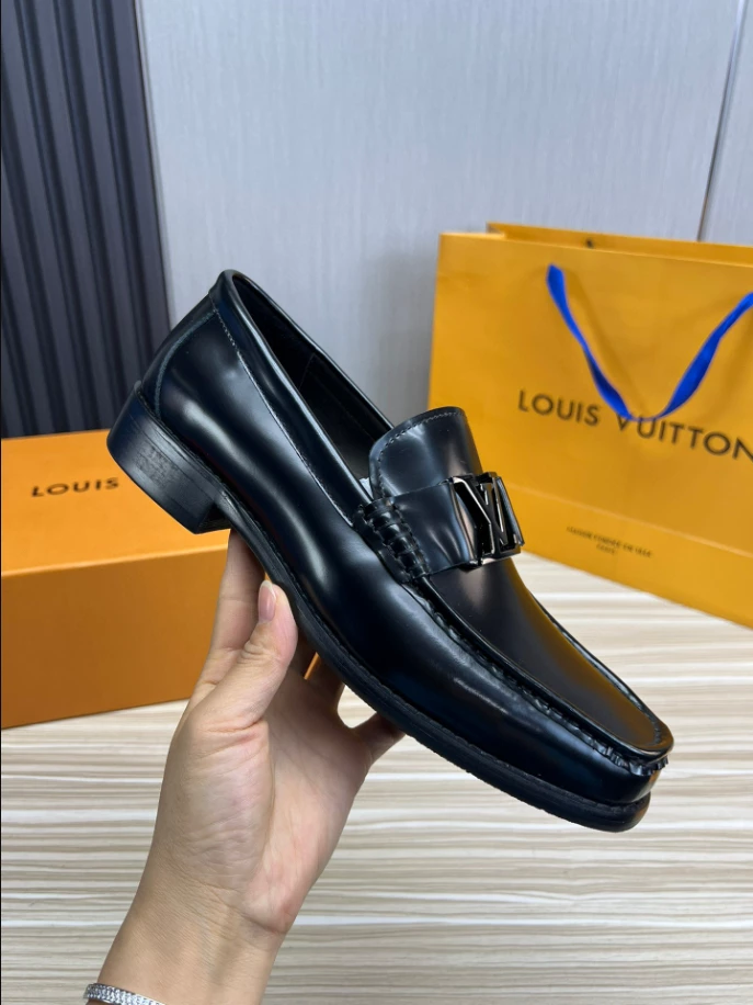 LV Montaigne Loafer crafted from premium waxed calf leather. showcasing refinement and luxury. Designed with a Blake construction and intricate hand-stitched details on the vamp and hand-painted edges. The standout feature is the LV initials accessory in antique gold finish. The leather outsole ensures durability and comfort. making it a perfect choice for modern fashion enthusiasts.