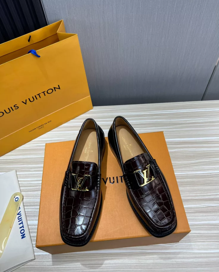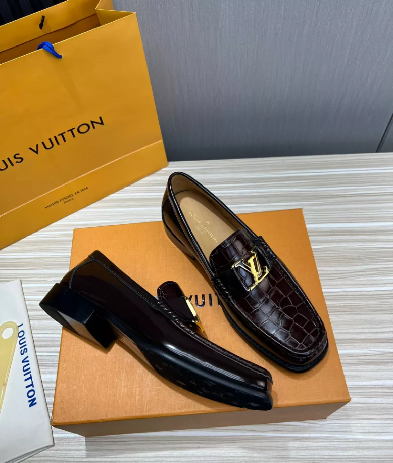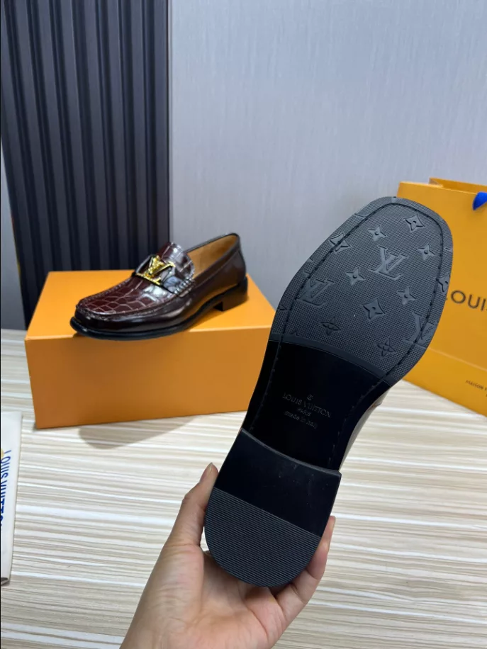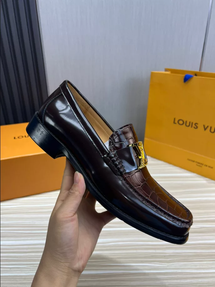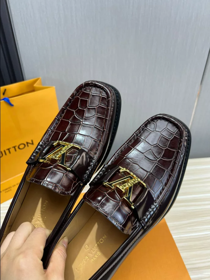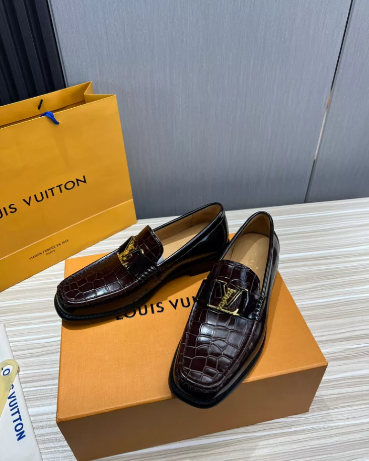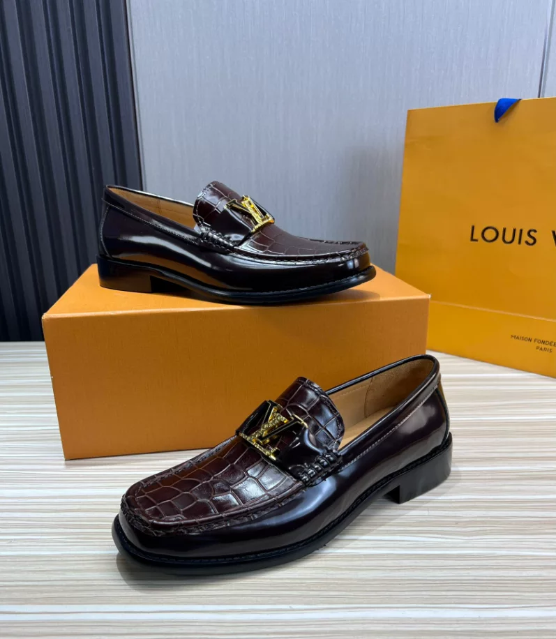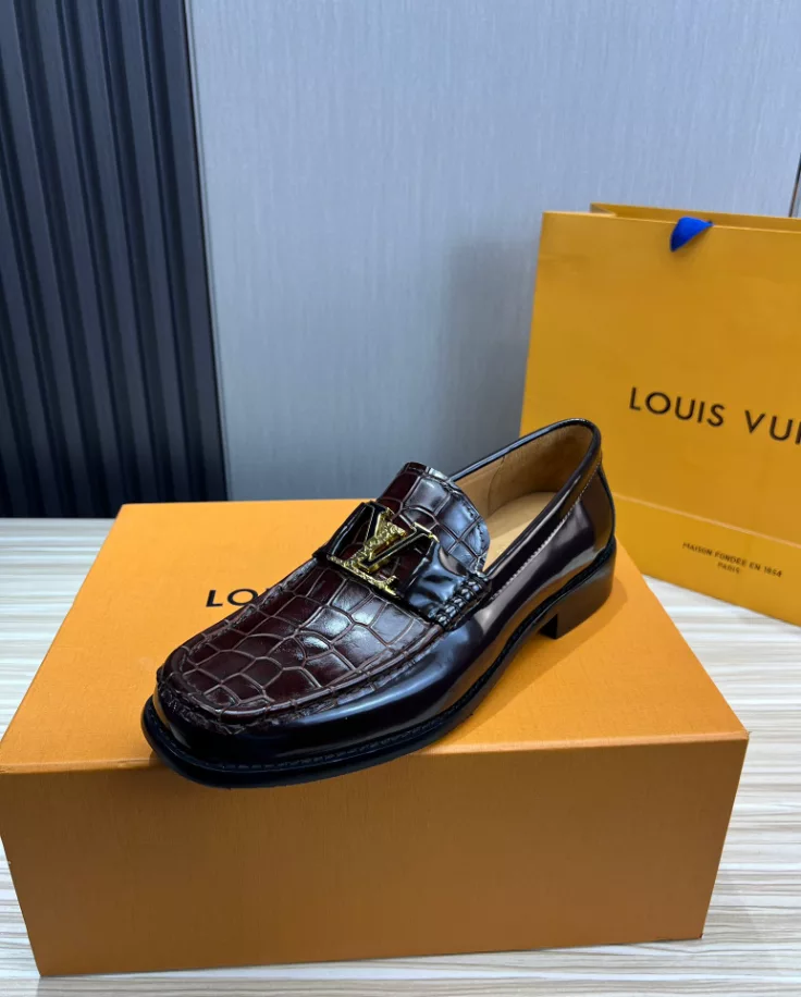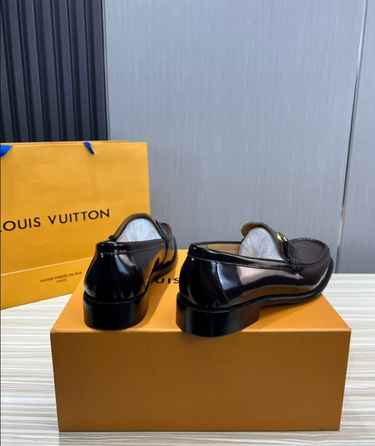LV Montaigne Loafer crafted from premium waxed calf leather. showcasing refinement and luxury. Designed with a Blake construction and intricate hand-stitched details on the vamp and hand-painted edges. The standout feature is the LV initials accessory in antique gold finish. The leather outsole ensures durability and comfort. making it a perfect choice for modern fashion enthusiasts.