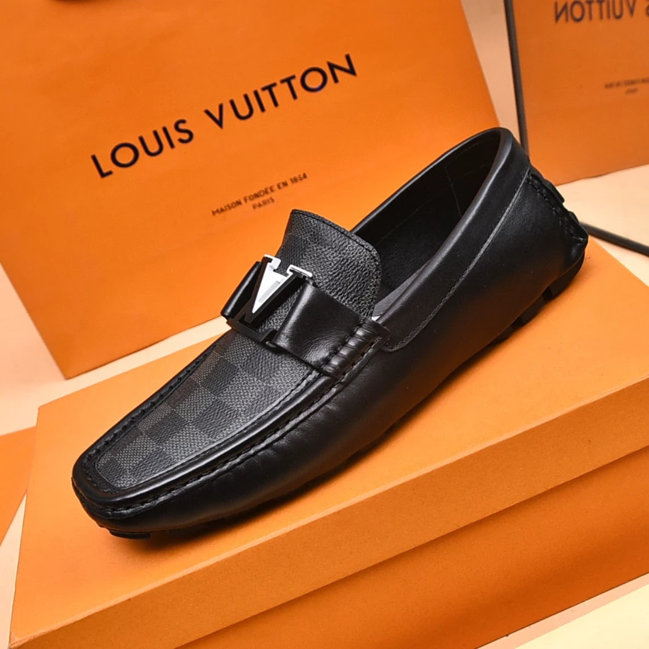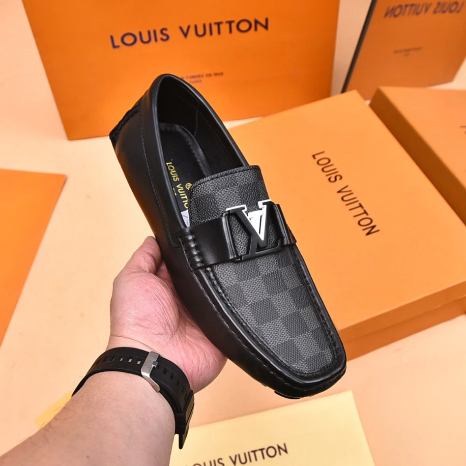 LV Monte Carlo Moccasin – Crafted from Louis Vuitton's distinctive grained Taiga calf leather. these Monte Carlo moccasins embody luxury. durability. and comfort. Their tubular construction without an insole ensures lightweight and flexibility. complemented by a hand-stitched vamp adorned with the signature LV Initials accessory. The flexible outsole with rubber pads at the front and heel enhances grip and durability. offering both comfort and elegance to the wearer.