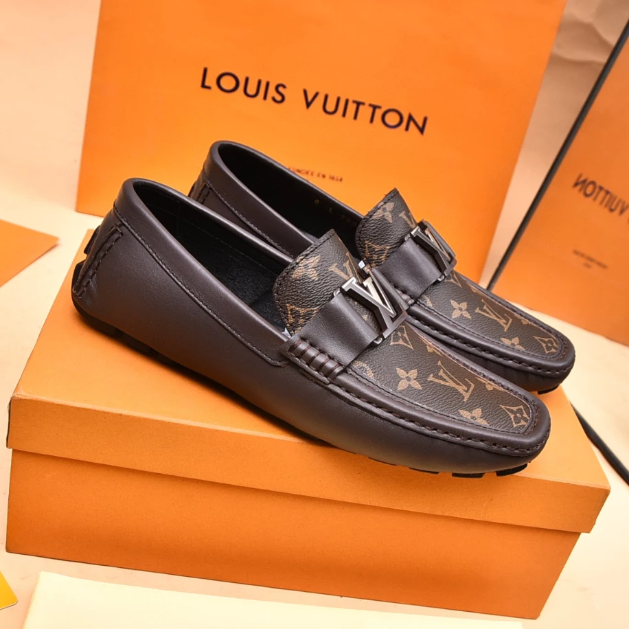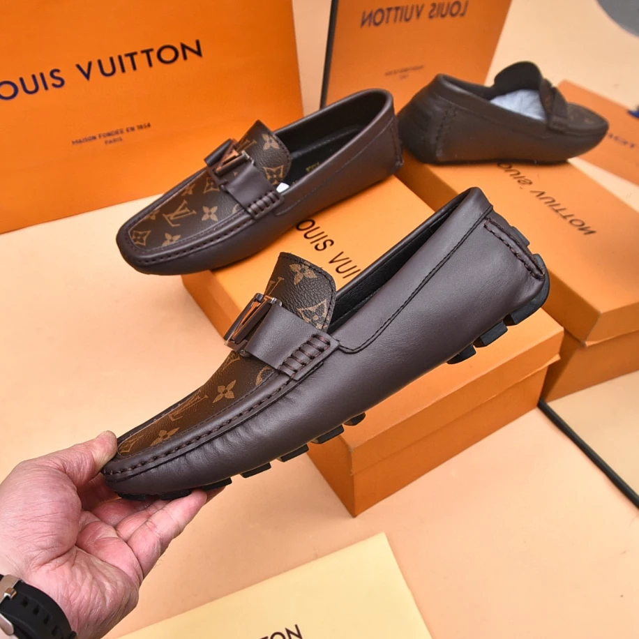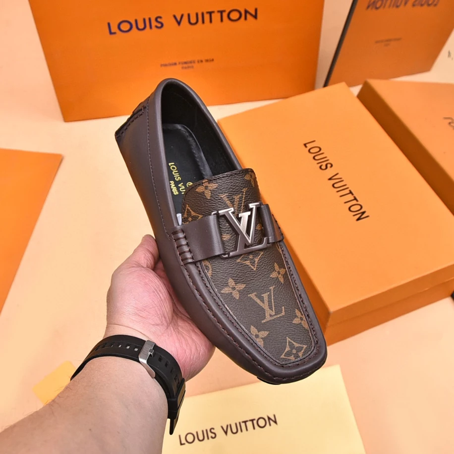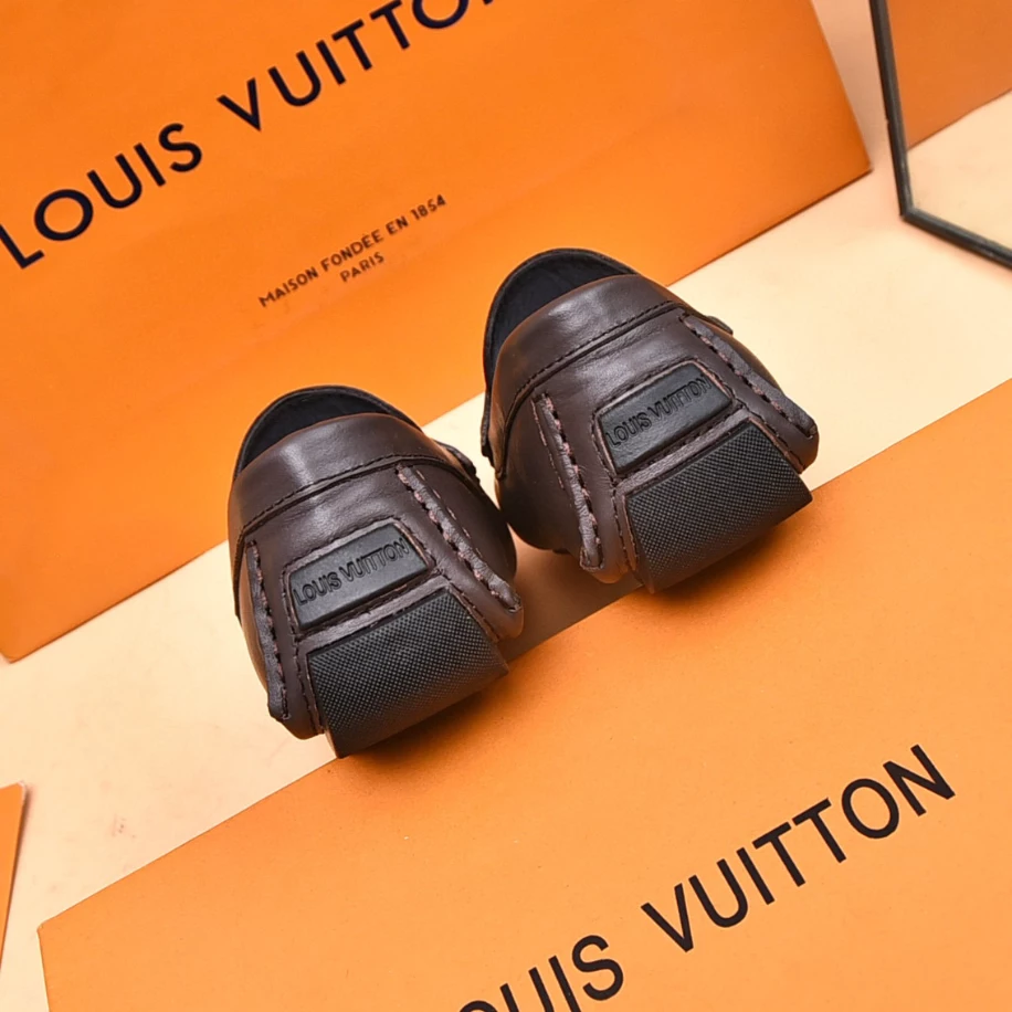 LV Monte Carlo Moccasin – Crafted from Louis Vuitton's distinctive grained Taiga calf leather. these Monte Carlo moccasins embody luxury. durability. and comfort. Their tubular construction without an insole ensures lightweight and flexibility. complemented by a hand-stitched vamp adorned with the signature LV Initials accessory. The flexible outsole with rubber pads at the front and heel enhances grip and durability. offering both comfort and elegance to the wearer.