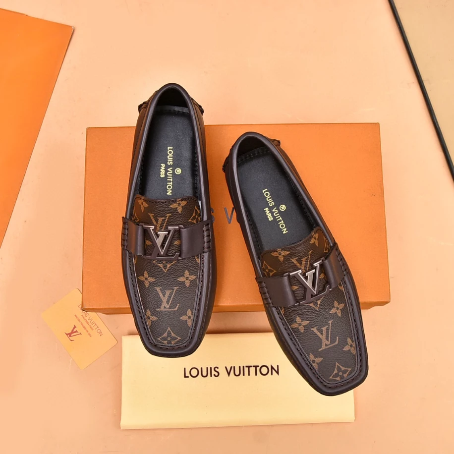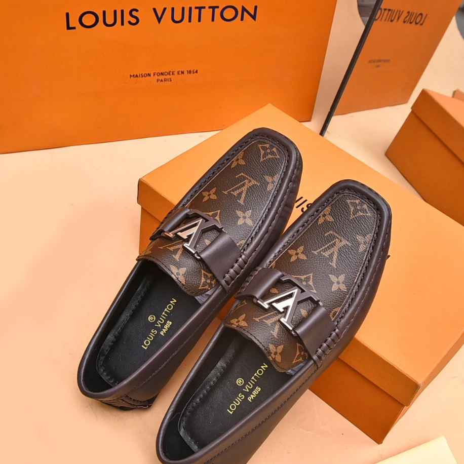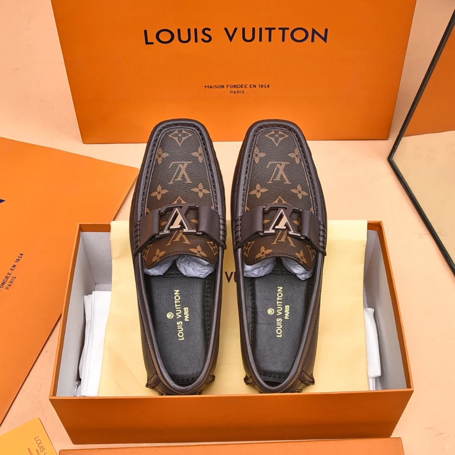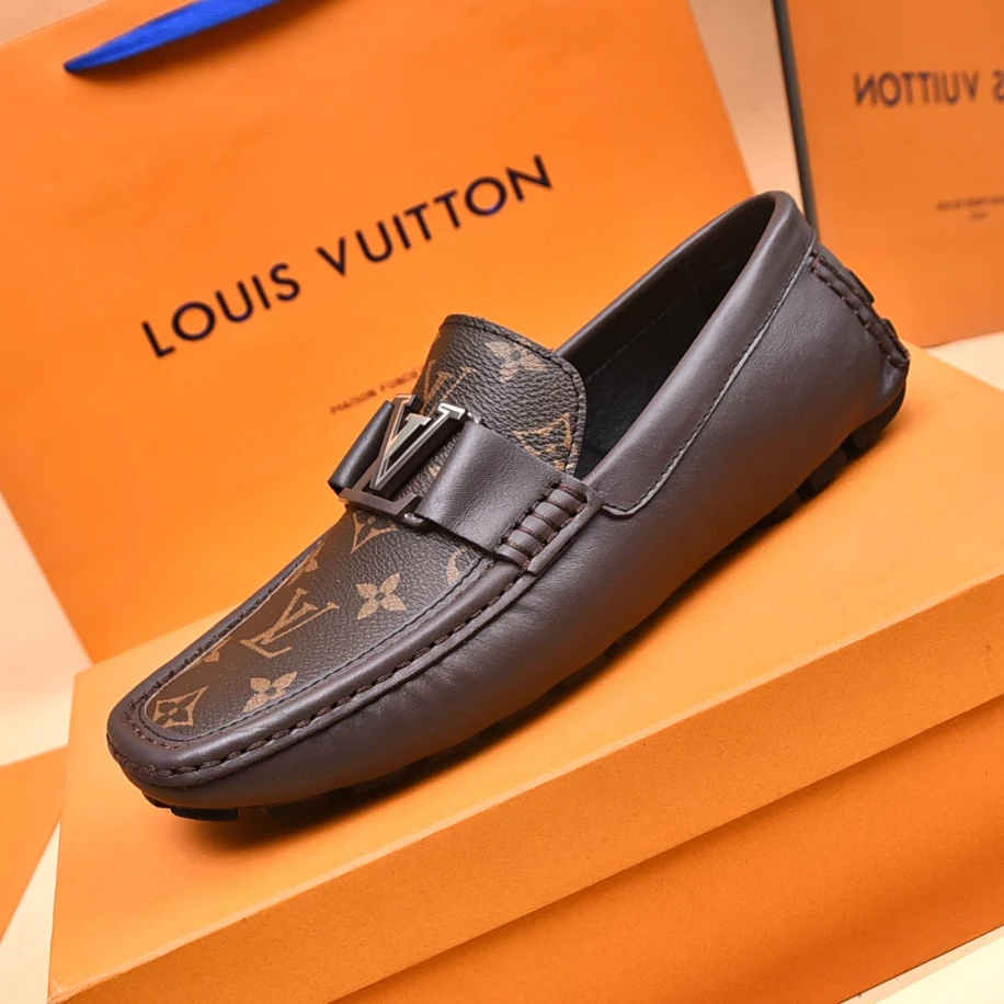 LV Monte Carlo Moccasin – Crafted from Louis Vuitton's distinctive grained Taiga calf leather. these Monte Carlo moccasins embody luxury. durability. and comfort. Their tubular construction without an insole ensures lightweight and flexibility. complemented by a hand-stitched vamp adorned with the signature LV Initials accessory. The flexible outsole with rubber pads at the front and heel enhances grip and durability. offering both comfort and elegance to the wearer.