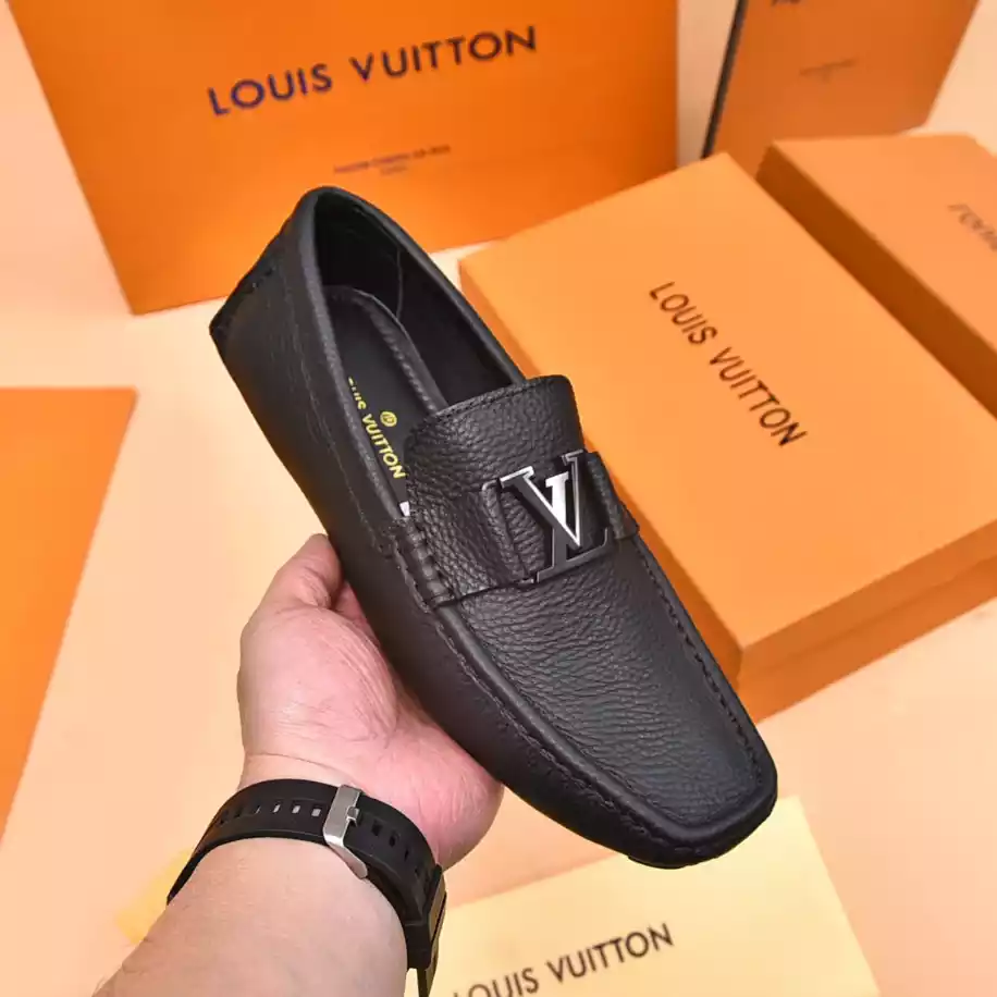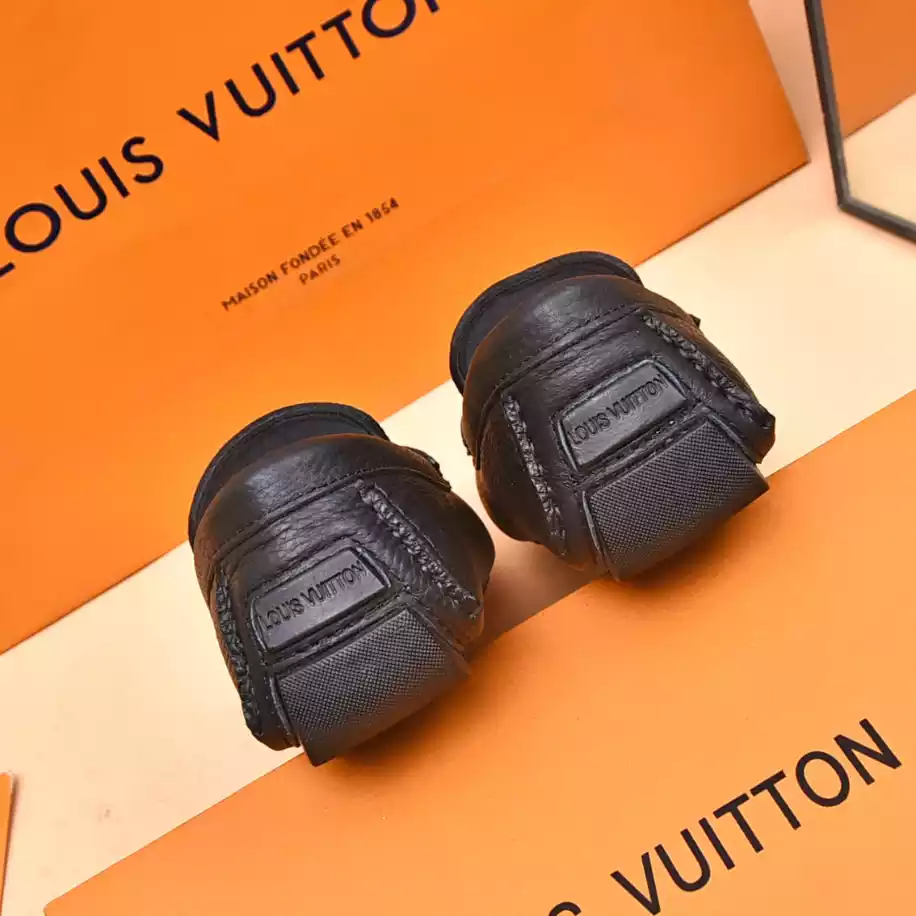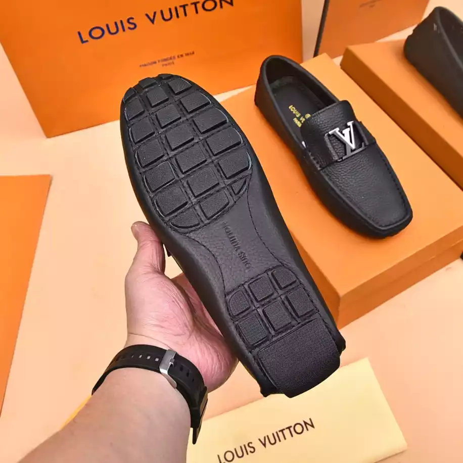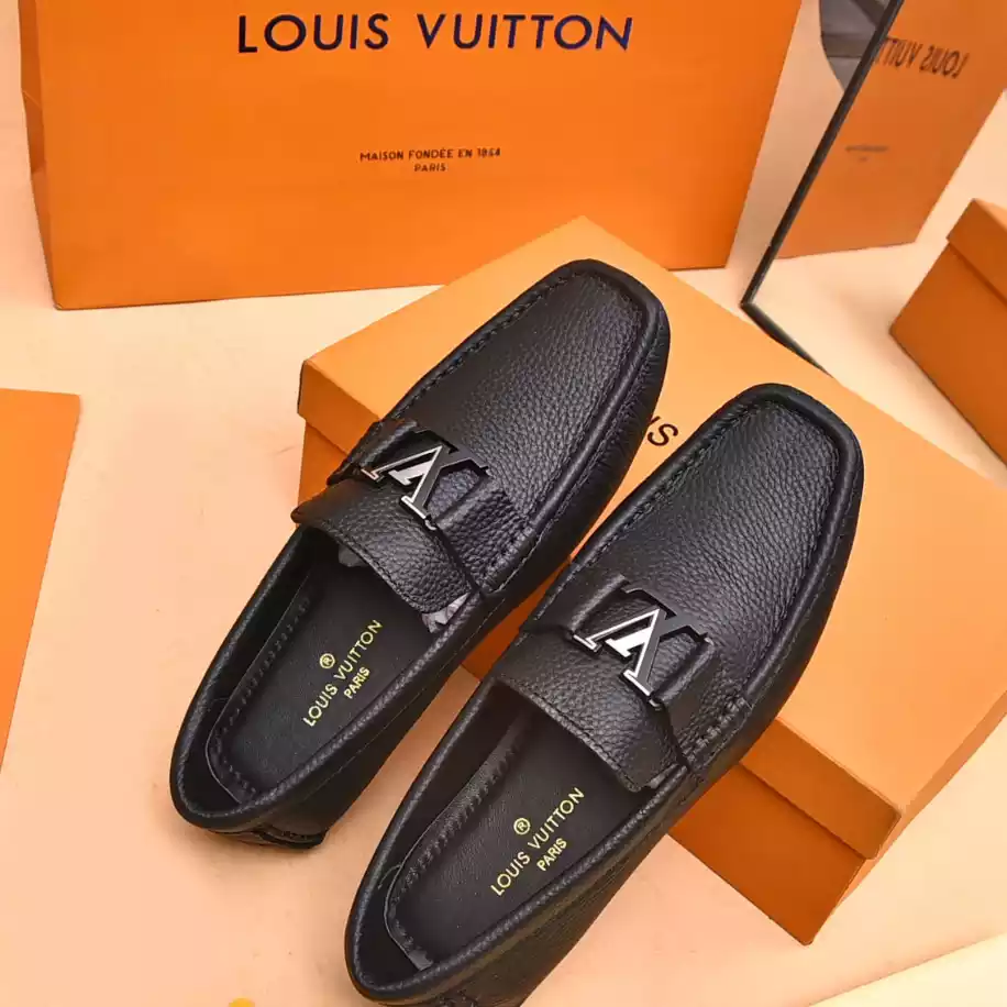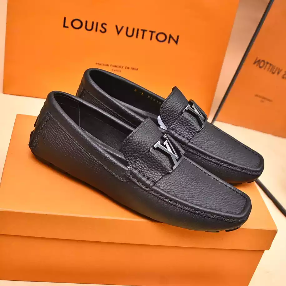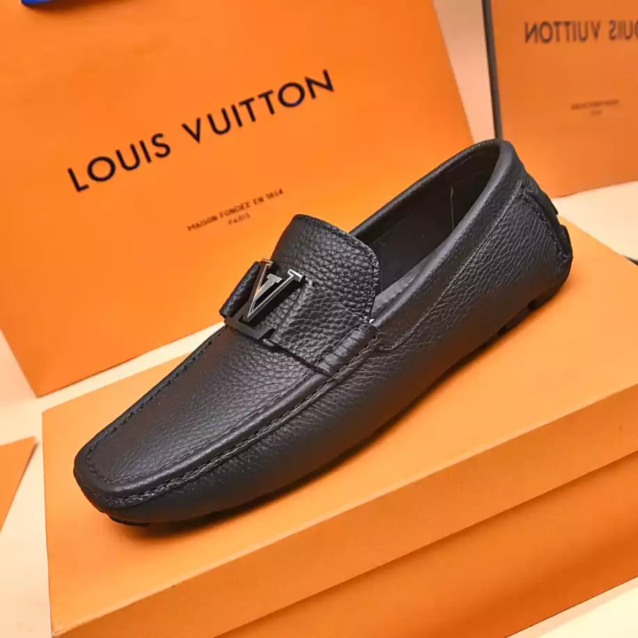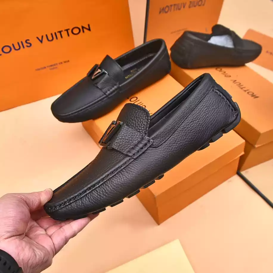 LV Monte Carlo Moccasin – Crafted from Louis Vuitton's distinctive grained Taiga calf leather. these Monte Carlo moccasins embody luxury. durability. and comfort. Their tubular construction without an insole ensures lightweight and flexibility. complemented by a hand-stitched vamp adorned with the signature LV Initials accessory. The flexible outsole with rubber pads at the front and heel enhances grip and durability. offering both comfort and elegance to the wearer.