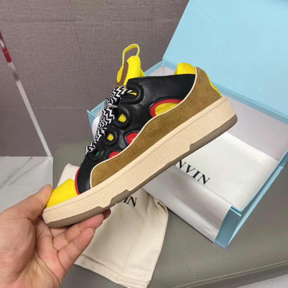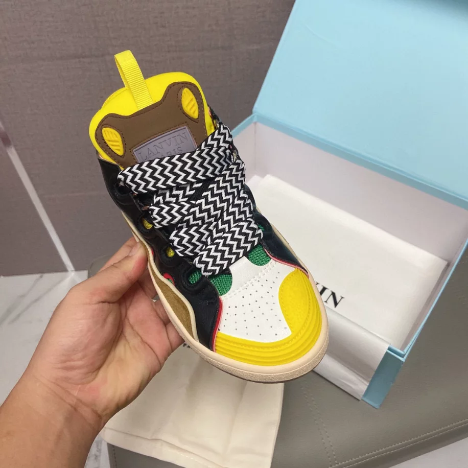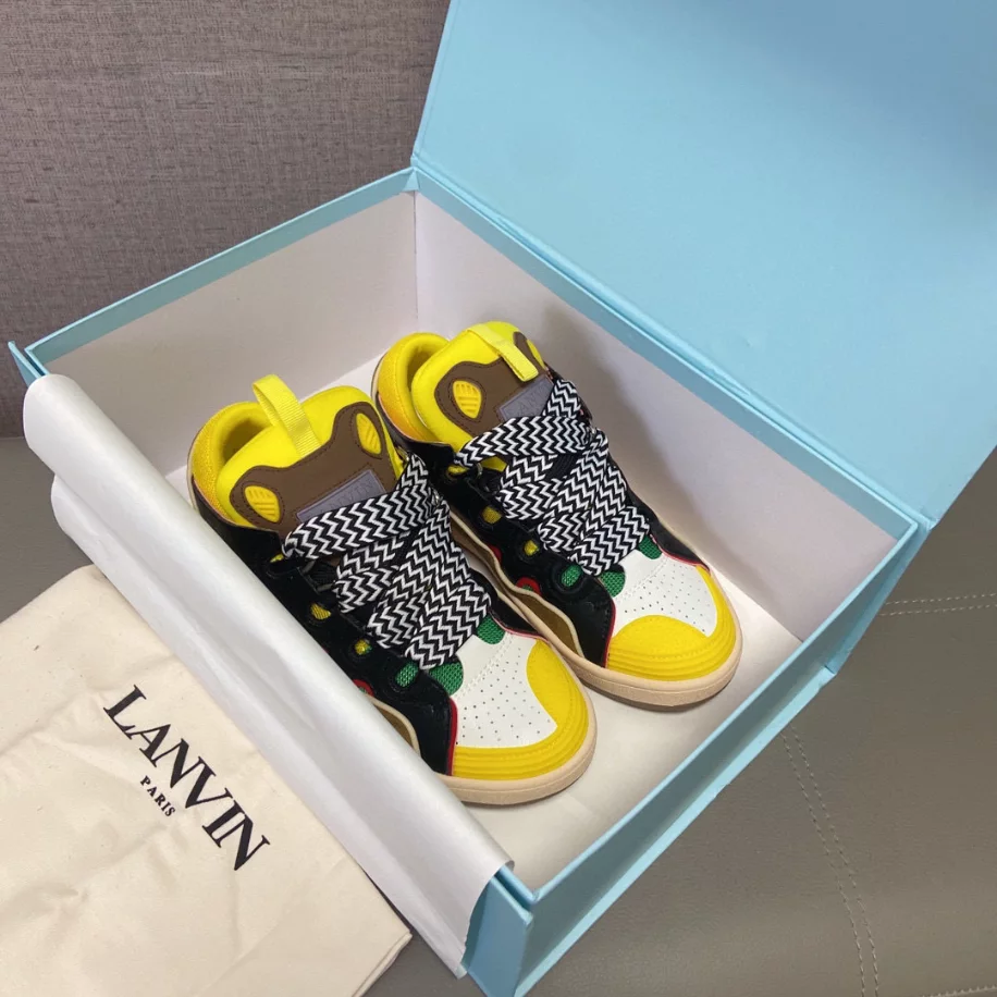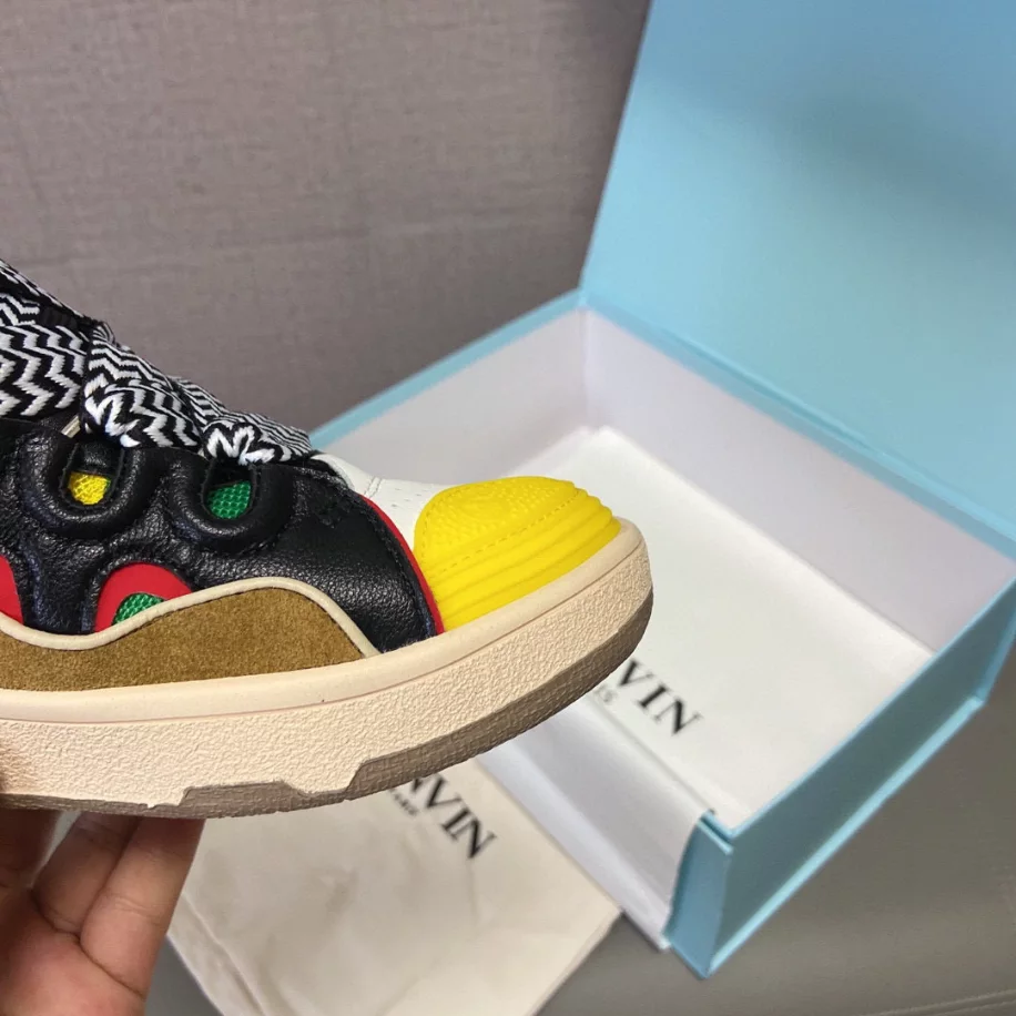The Lanvin Leather Curb Sneaker draws inspiration from the 90s. showcasing a bold design with exaggerated proportions. Crafted from nappa calfskin. suede. and mesh. this intricately designed shoe offers remarkable comfort with its rounded shape. padded tongue. and metallic eyelets.