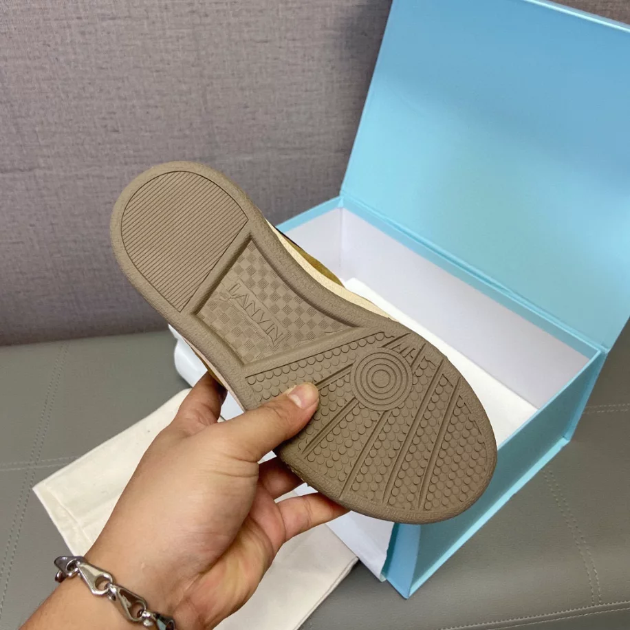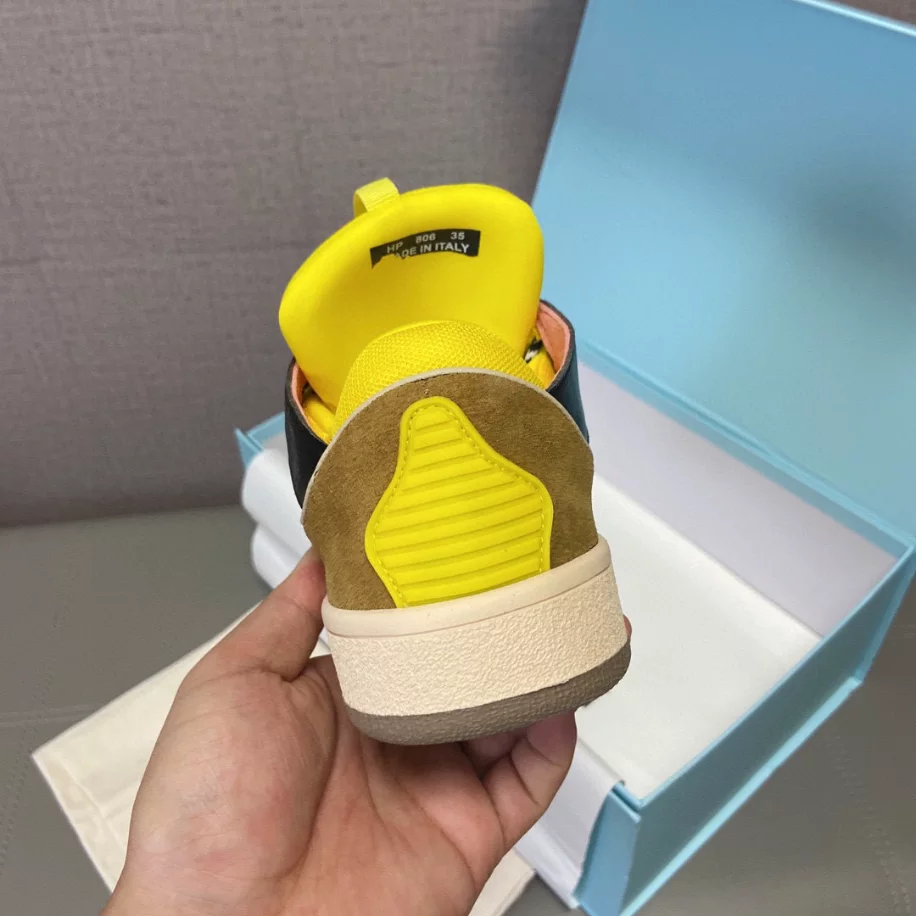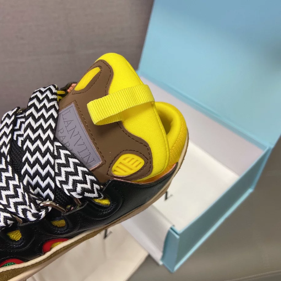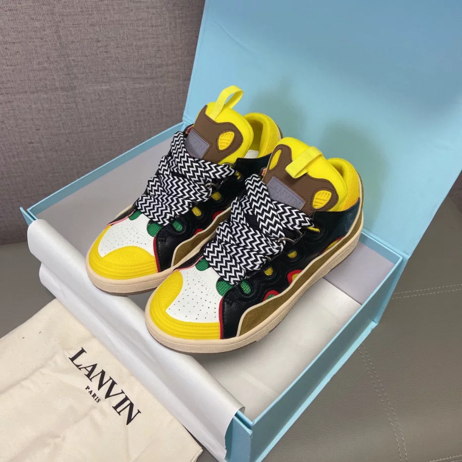 The Lanvin Leather Curb Sneaker draws inspiration from the 90s. showcasing a bold design with exaggerated proportions. Crafted from nappa calfskin. suede. and mesh. this intricately designed shoe offers remarkable comfort with its rounded shape. padded tongue. and metallic eyelets.