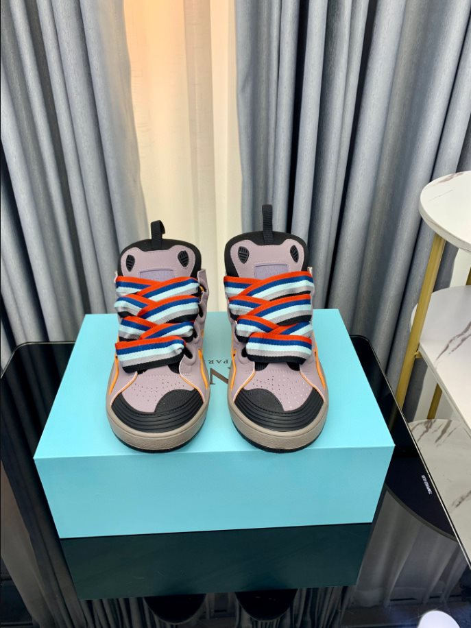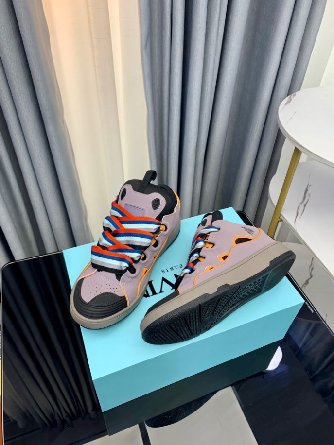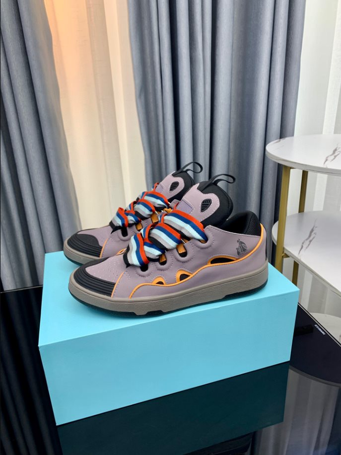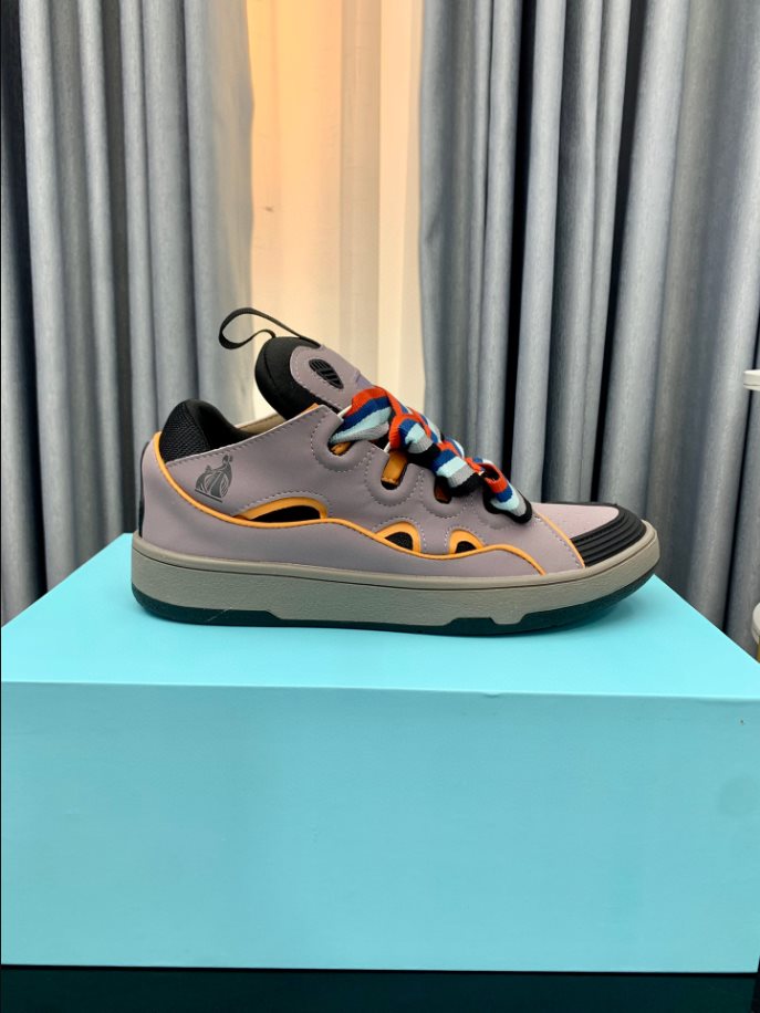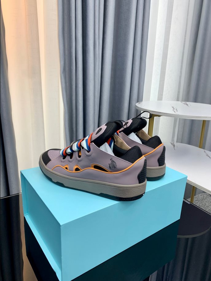 The Lanvin Leather Curb Sneaker draws inspiration from the 90s. showcasing a bold design with exaggerated proportions. Crafted from nappa calfskin. suede. and mesh. this intricately designed shoe offers remarkable comfort with its rounded shape. padded tongue. and metallic eyelets.