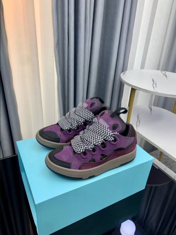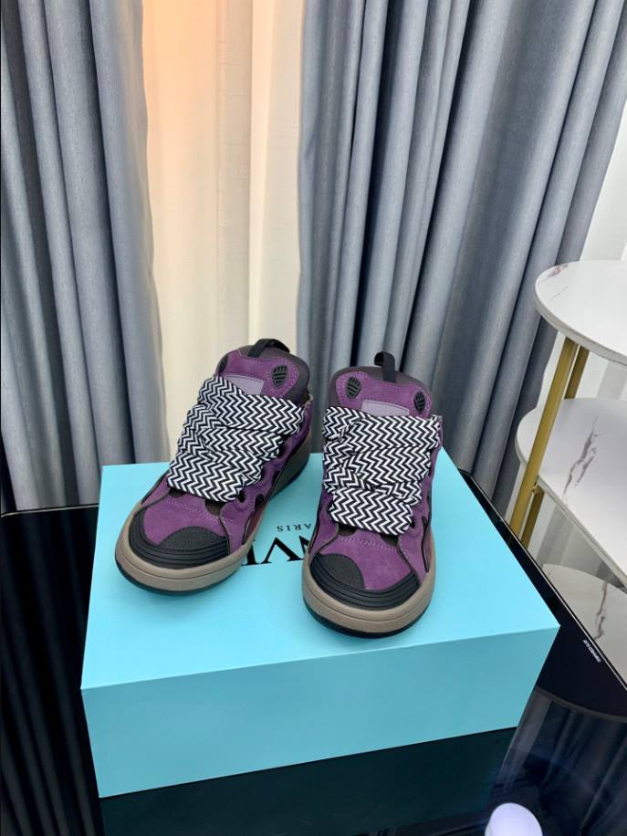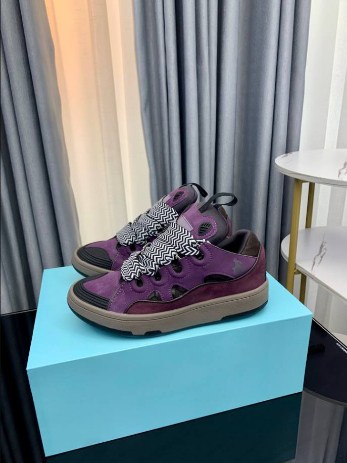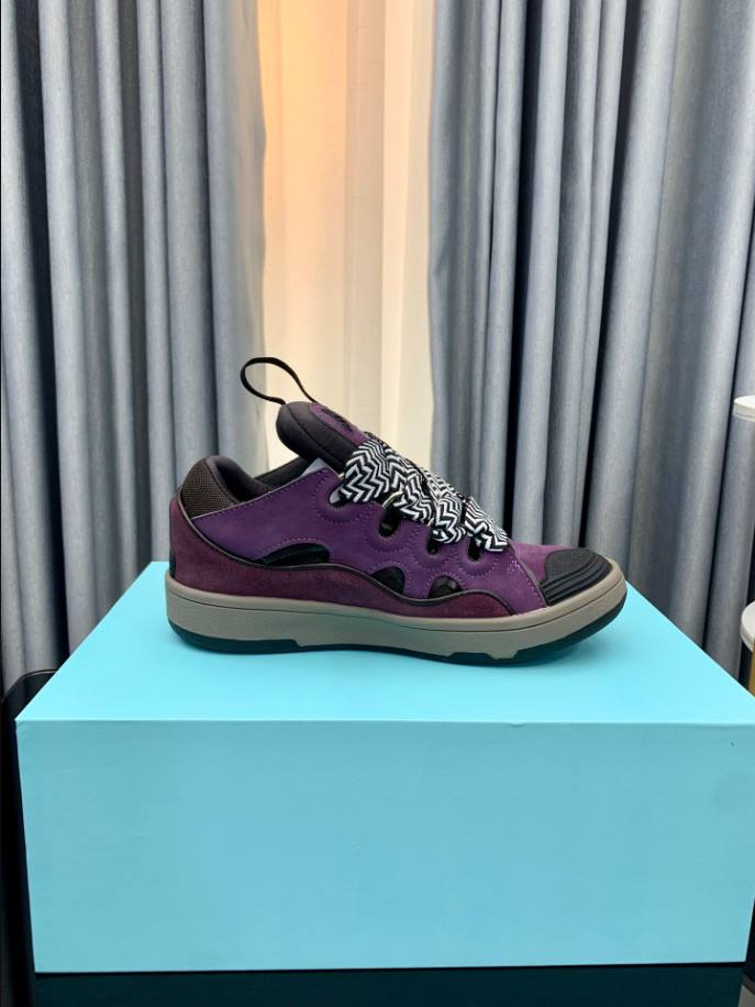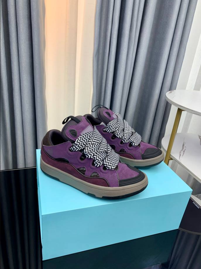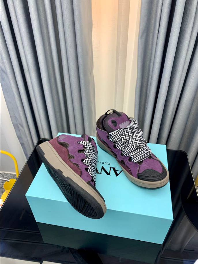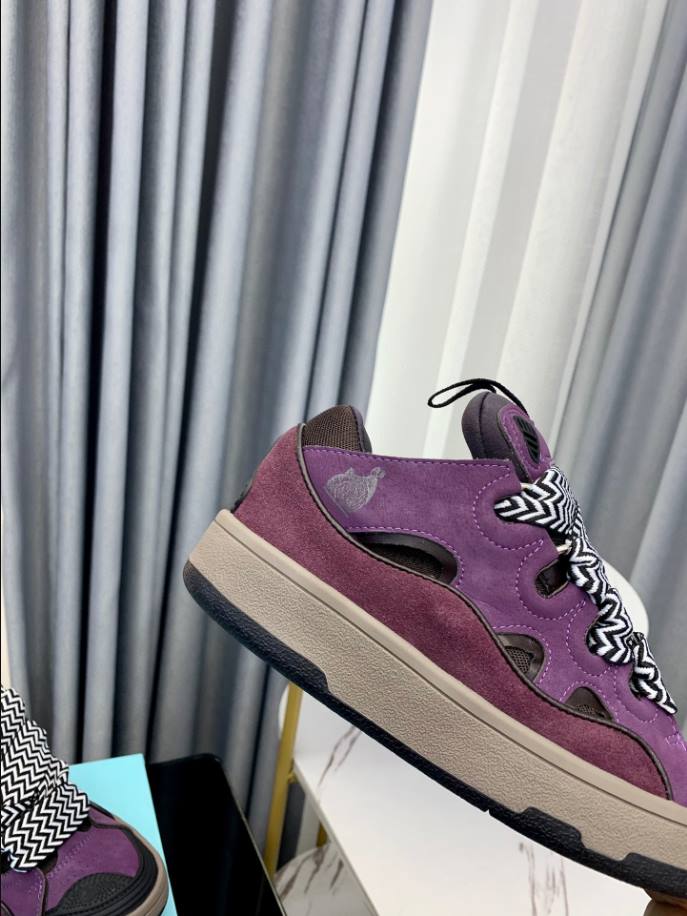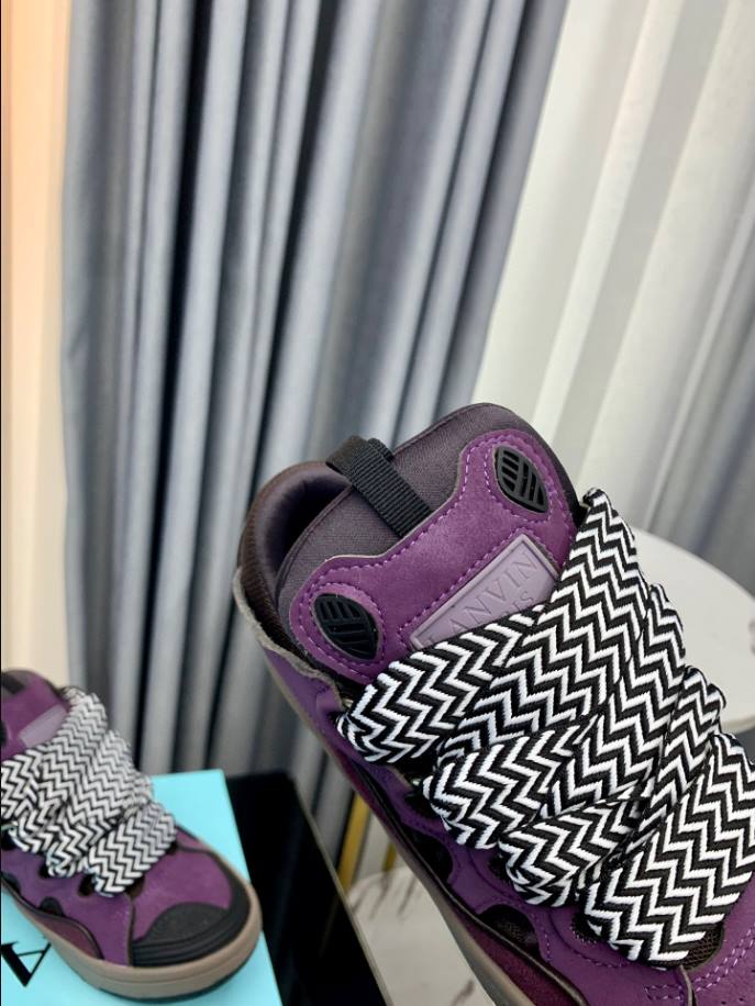 The Lanvin Leather Curb Sneaker draws inspiration from the 90s. showcasing a bold design with exaggerated proportions. Crafted from nappa calfskin. suede. and mesh. this intricately designed shoe offers remarkable comfort with its rounded shape. padded tongue. and metallic eyelets.
