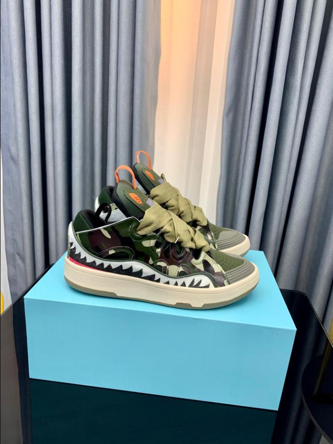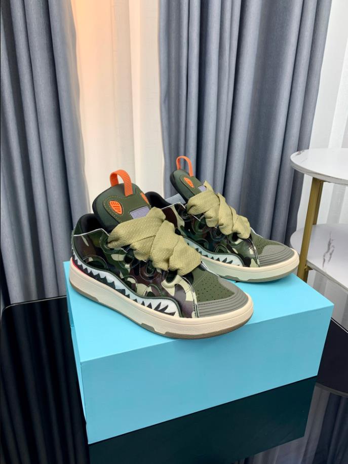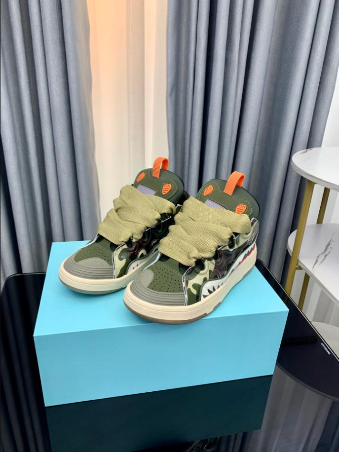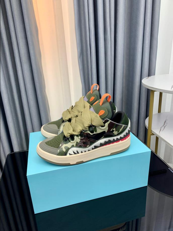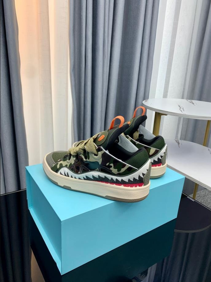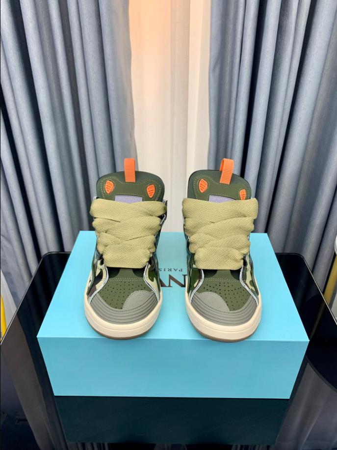 The Lanvin Leather Curb Sneaker draws inspiration from the 90s. showcasing a bold design with exaggerated proportions. Crafted from nappa calfskin. suede. and mesh. this intricately designed shoe offers remarkable comfort with its rounded shape. padded tongue. and metallic eyelets.