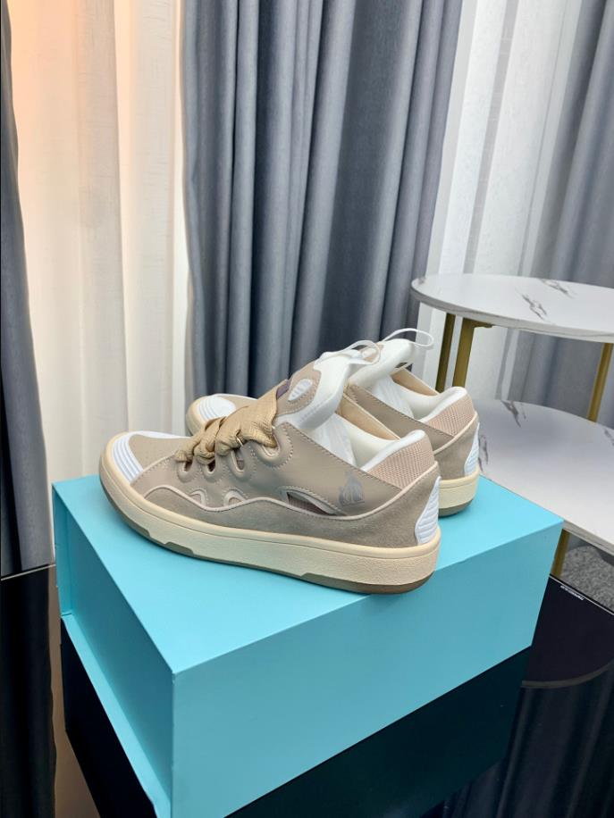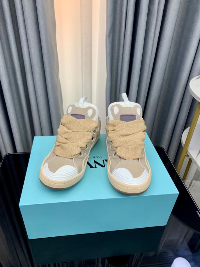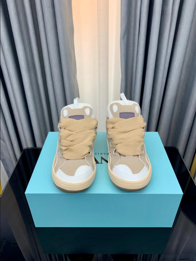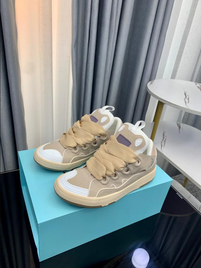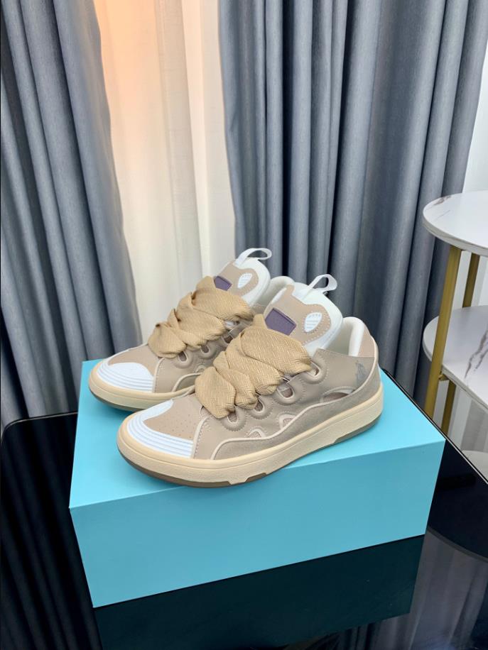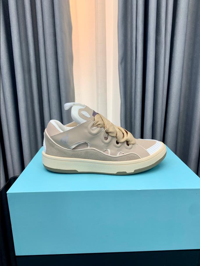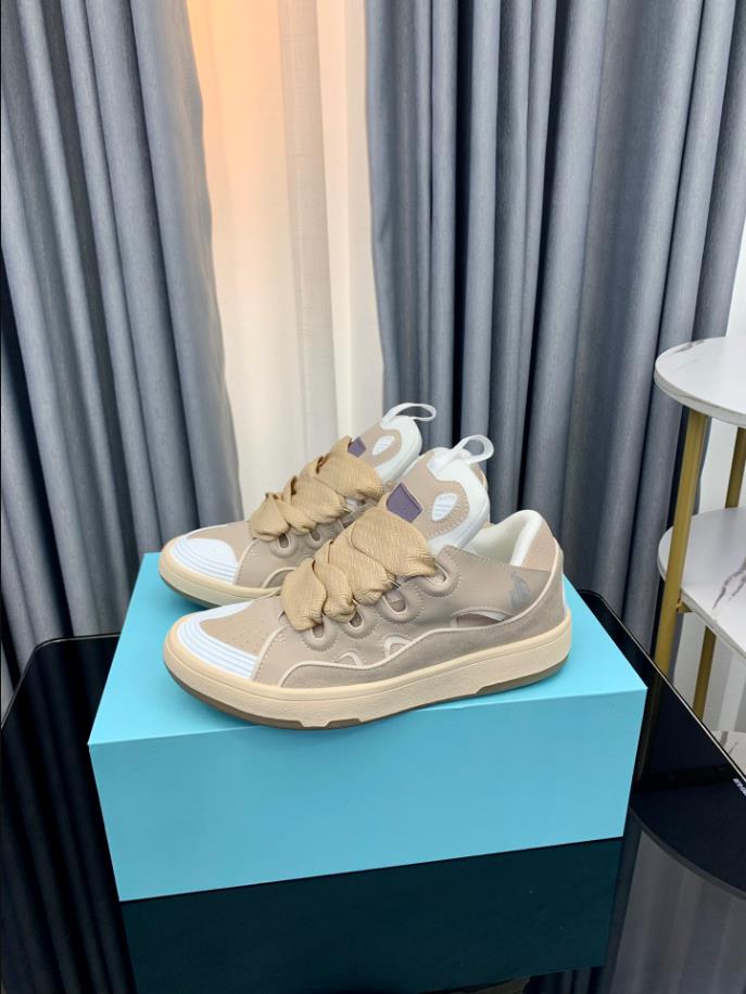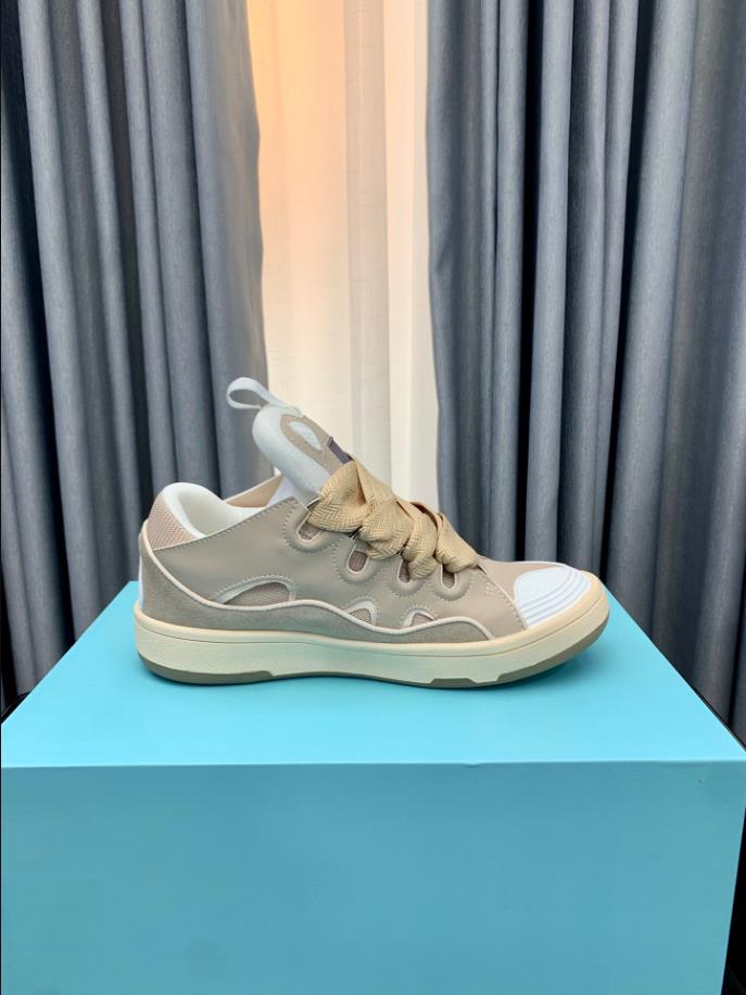 The Lanvin Leather Curb Sneaker draws inspiration from the 90s. showcasing a bold design with exaggerated proportions. Crafted from nappa calfskin. suede. and mesh. this intricately designed shoe offers remarkable comfort with its rounded shape. padded tongue. and metallic eyelets.