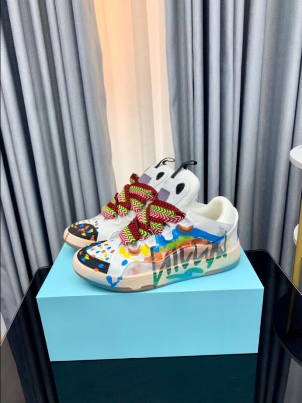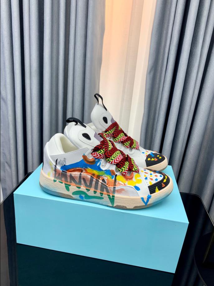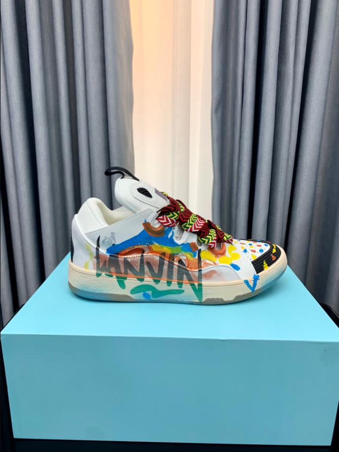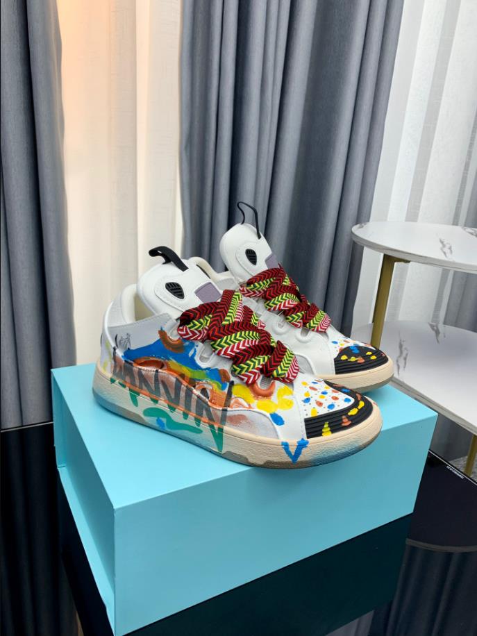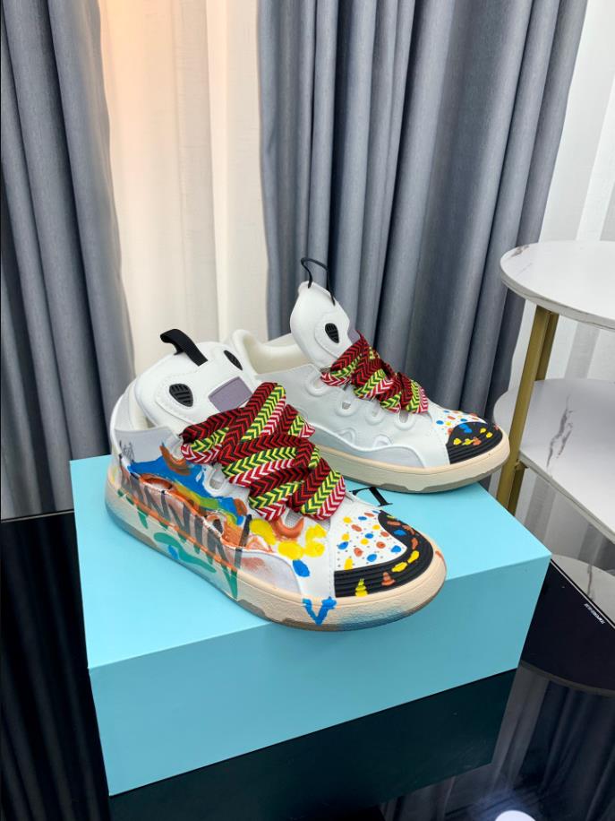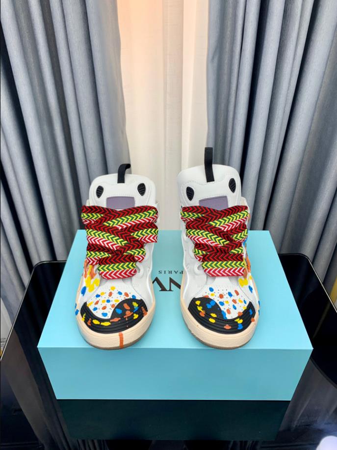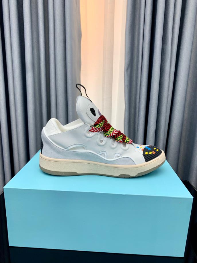 The Lanvin Leather Curb Sneaker draws inspiration from the 90s. showcasing a bold design with exaggerated proportions. Crafted from nappa calfskin. suede. and mesh. this intricately designed shoe offers remarkable comfort with its rounded shape. padded tongue. and metallic eyelets.