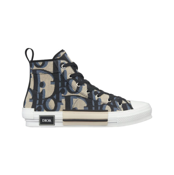 Dior B23 High-Top Sneaker – featuring the iconic Maxi Dior Oblique jacquard pattern in beige and black. It seamlessly combines luxury with streetwear style. The sneaker incorporates traditional elements like eyelets and a lace-up front. along with modern details such as a white rubber sole with contrasting inserts for a dynamic look. Crafted with attention to detail. it boasts a reinforced toe and a rear pull tab for added functionality. Inside. the supple calfskin lining ensures comfort with every step.