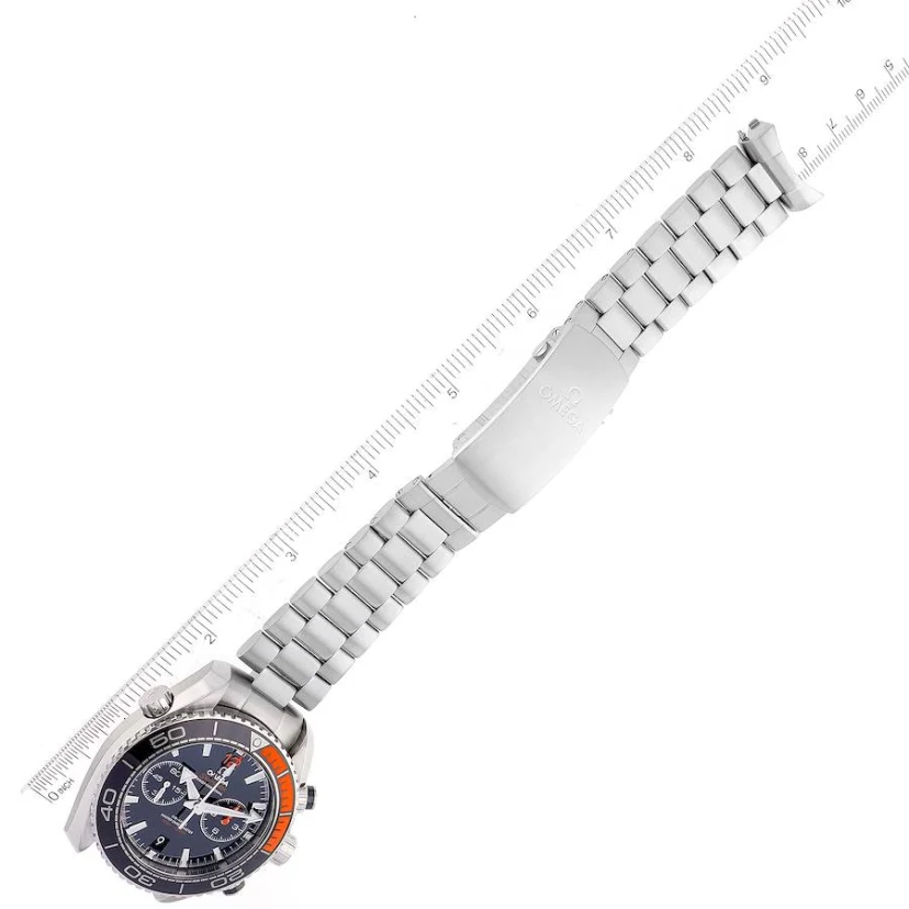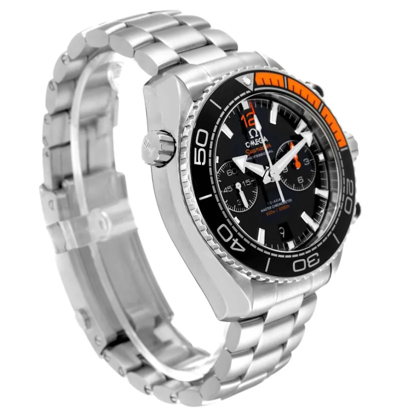 Stainless steel & black/orange ceramic 45.5mm case and bezel all on a stainless steel bracelet. This men's watch has a black dial with polished and luminous applied hands and hour markers, date display at the 6 o'clock position. Water resistant up to 600m and sapphire crystal glass. Power reserve up to 60 hours. OMEGA calibre 9900 automatic chronograph movement.