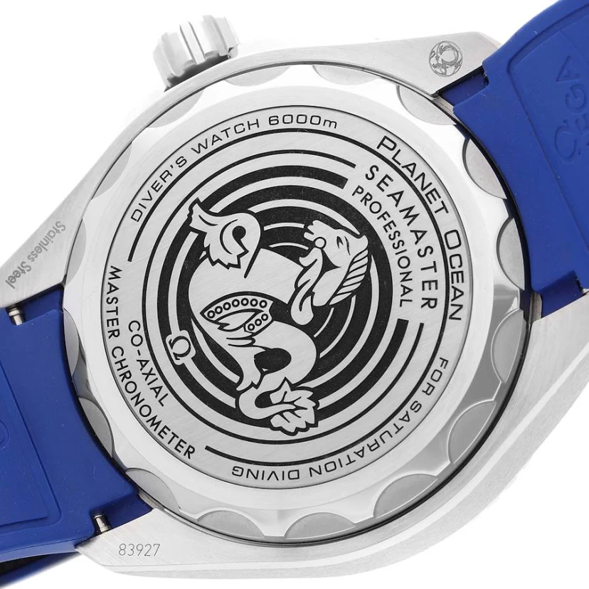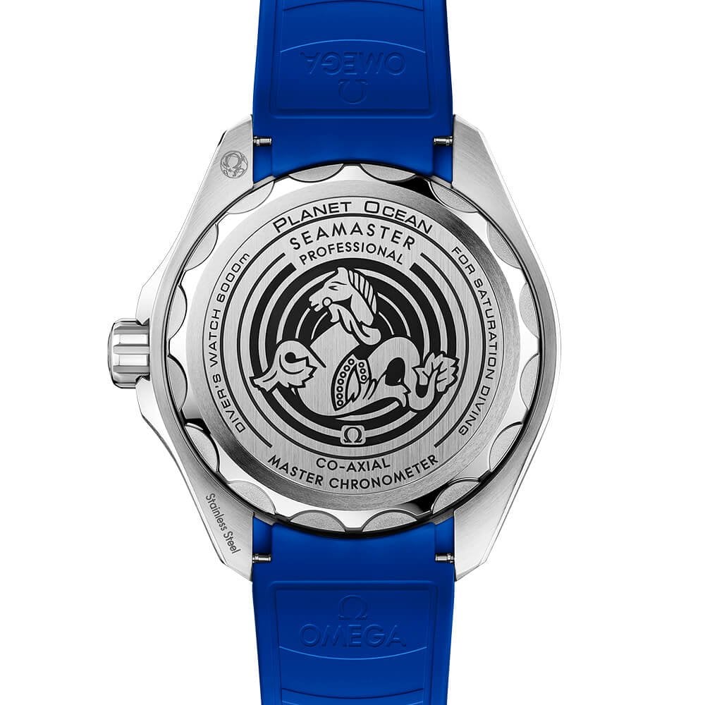 The robust and powerful-looking Omega Seamaster Planet Ocean Ultra Deep 600M watch is the ultimate dive tool. The model is a descendant of the Ultra Deep watch that took part in the Five Deeps Expedition in 2019, reaching the deepest part of the Earth. The Ultra Deep watch has been tested in real ocean conditions and offers an impressive 600-meter water resistance inside a 45.5mm O-MEGASTEEL case. On top of this case is a polished blue liquid ceramic insert upon a unidirectional rotating bezel displaying a 60-minute dive scale in white enamel. These white tones match the white dial of this Omega Seamaster Planet Ocean Ultra Deep watch. The display is equipped with Super-LumiNova-coated hands and baton hour markers, combined with deep blue Arabic numerals at 12, 3, 6 and 9 o’clock. These Features are all protected under a domed sapphire crystal glass. This Omega dive watch also Features a screw-down crown at 3 o’clock and is powered by the Omega Co-Axial Master Chronometer Calibre 8912, which sits behind a titanium medallion and a laser-engraved Sonar emblem with the iconic OMEGA Seahorse at its centre. To finish with, the Omega Seamaster Planet Ocean Ultra Deep 600M is fitted on a black rubber strap with blue lining and an O-MEGASTEEL buckle.