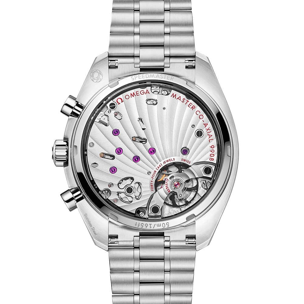 Inspired by chronograph wristwatches from the 1940s – this Omega Speedmaster Chronoscope Co-Axial Master Chronometer Chronograph is a 43mm model crafted from stainless steel. Underneath a strong anti reflective sapphire crystal glass front and inside a black anodised aluminium bezel featuring a tachymeter scale, is a silver dial with a unique “spiral” track pattern running beneath each Arabic numeral hour marker in a matching black hue. The leaf-shaped hands join with three measuring scales offering telemeter, pulsometer and tachymeter functions, finished against a 1940’s “snail” design, as well as chronograph sub-scales at 3 and 9 o’clock offering 12-hour and small second functions. This men’s Omega Speedmaster Chronoscope Co-Axial Master Chronometer Chronograph is finished on a stainless steel bracelet with a folding clasp and Features a sapphire crystal glass exhibition caseback that exposes the Co-Axial Master Chronometer Calibre 9908 through its lens. This movement provides a 60-hour power reserve and Features a column wheel and Co-Axial escapement, together with a silicon balance-spring, two barrels mounted in series, and a time zone function