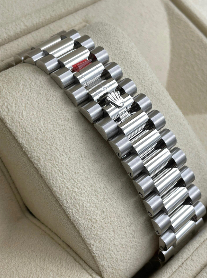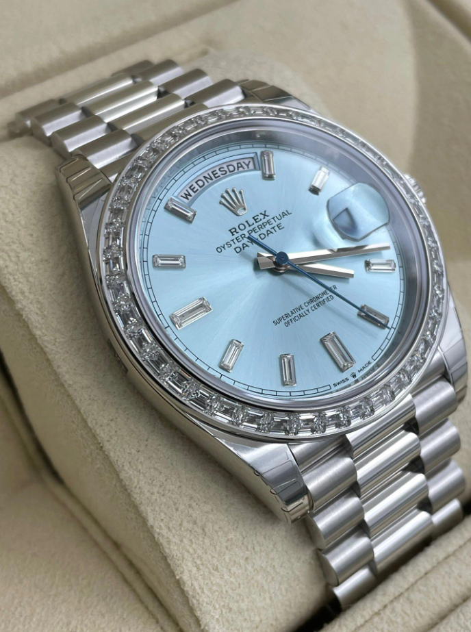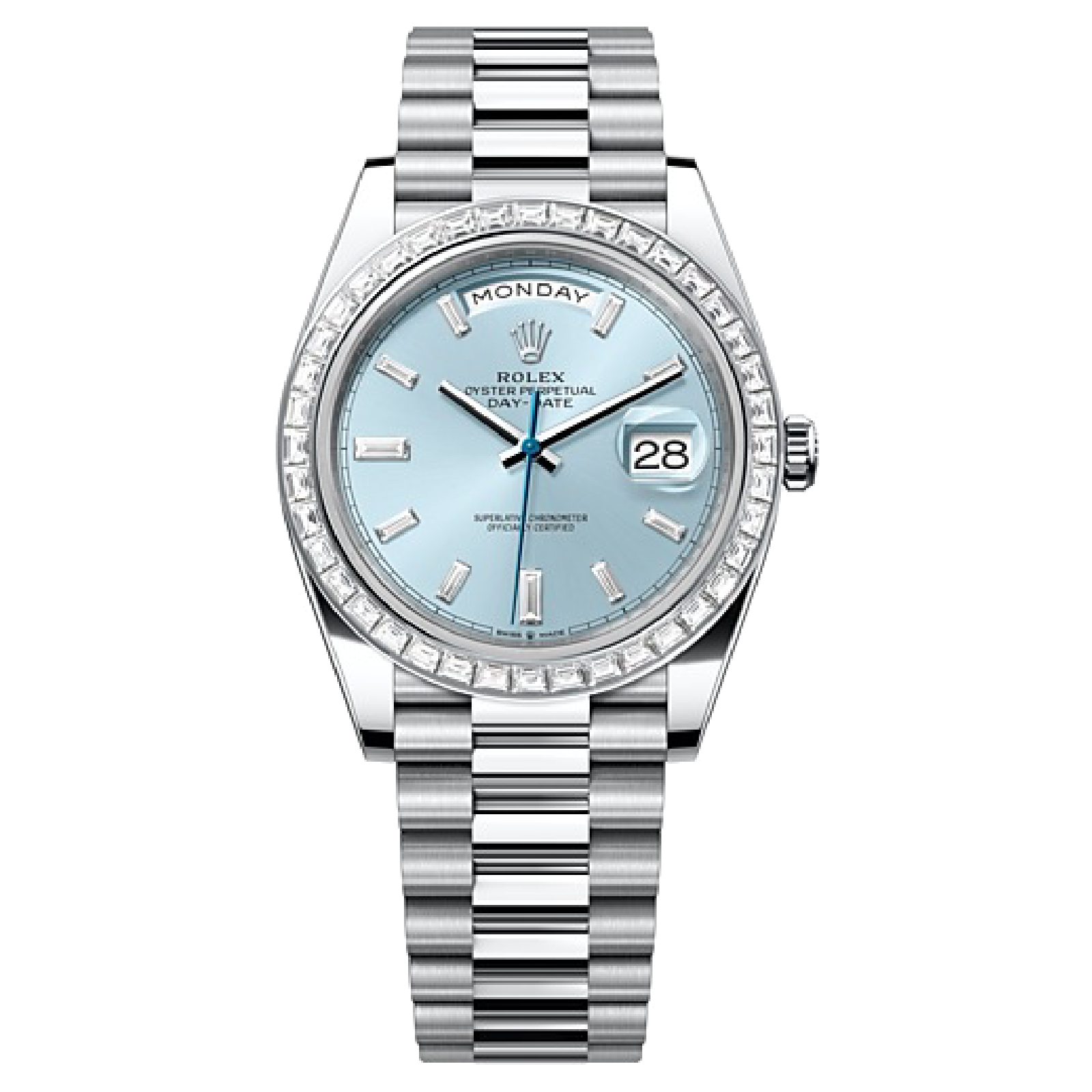 The ice-blue dial is the discreet and exclusive signature of a Rolex platinum watch. Rolex uses platinum, the noblest of metals, for the finest of watches. These exclusive dials can be found only on the Day-Date and the Cosmograph Daytona.