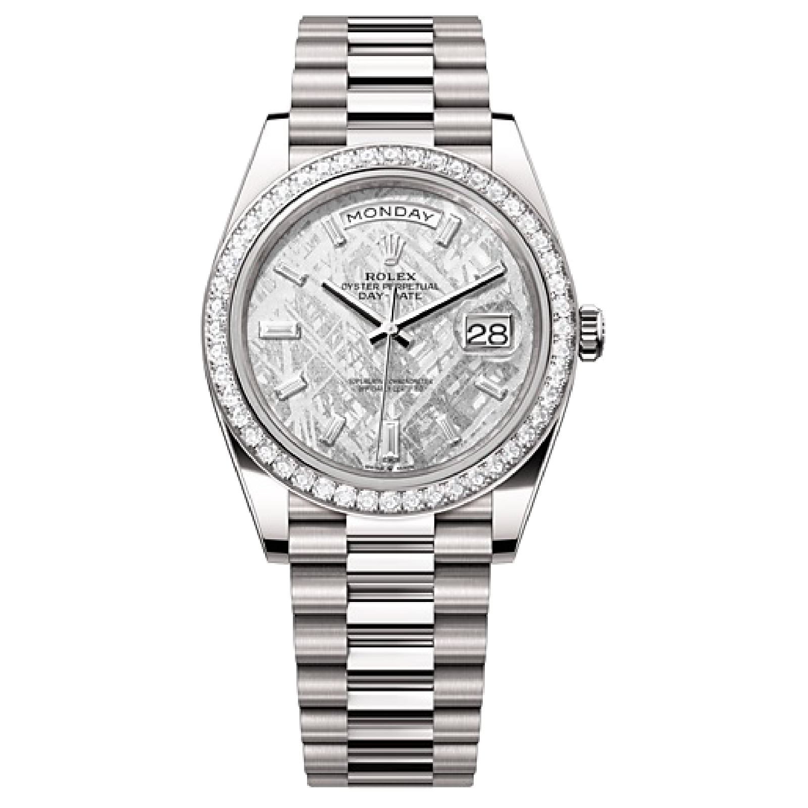 This dial features 10 baguette-cut diamonds. Formed in the far reaches of the solar system, metallic meteorite comes from an asteroid that exploded millions of years ago. On the voyage between planets, fragments of this natural extraterrestrial material, primarily composed of iron and nickel, cool by a few degrees Celsius every million years, creating unique, distinctive crystallization within the material that is impossible to recreate on Earth. Metallic meteorite is rare and challenging to work with, but once it is cut into thin sections and a chemical treatment is applied, the great beauty of its interwoven internal structure is revealed. These fascinating and varied formations are known as Widmanstätten patterns. For its dials, Rolex works with leading experts in the field and selects only the sections of meteorite with a particularly well-formed surface rich in different shapes and reflections.