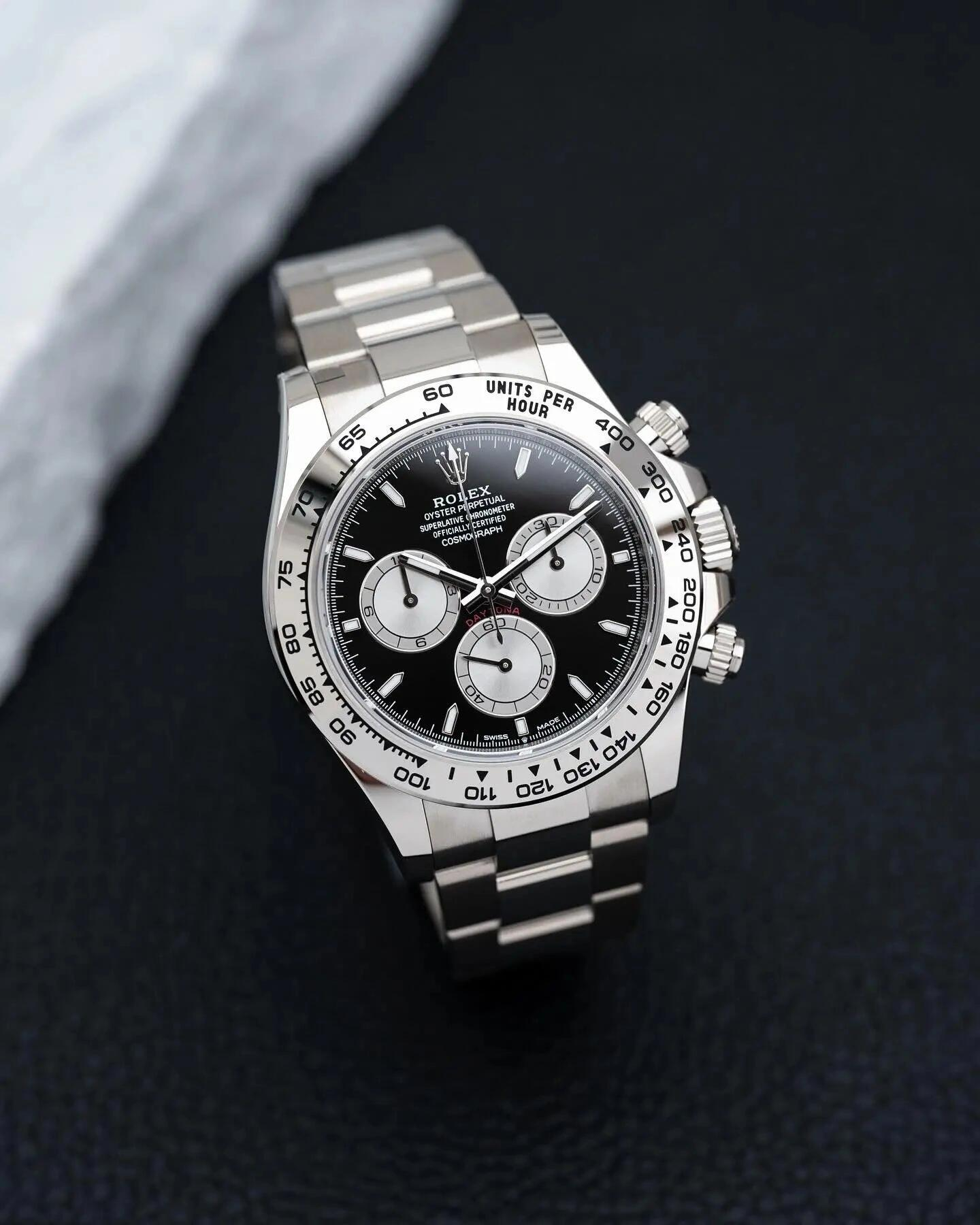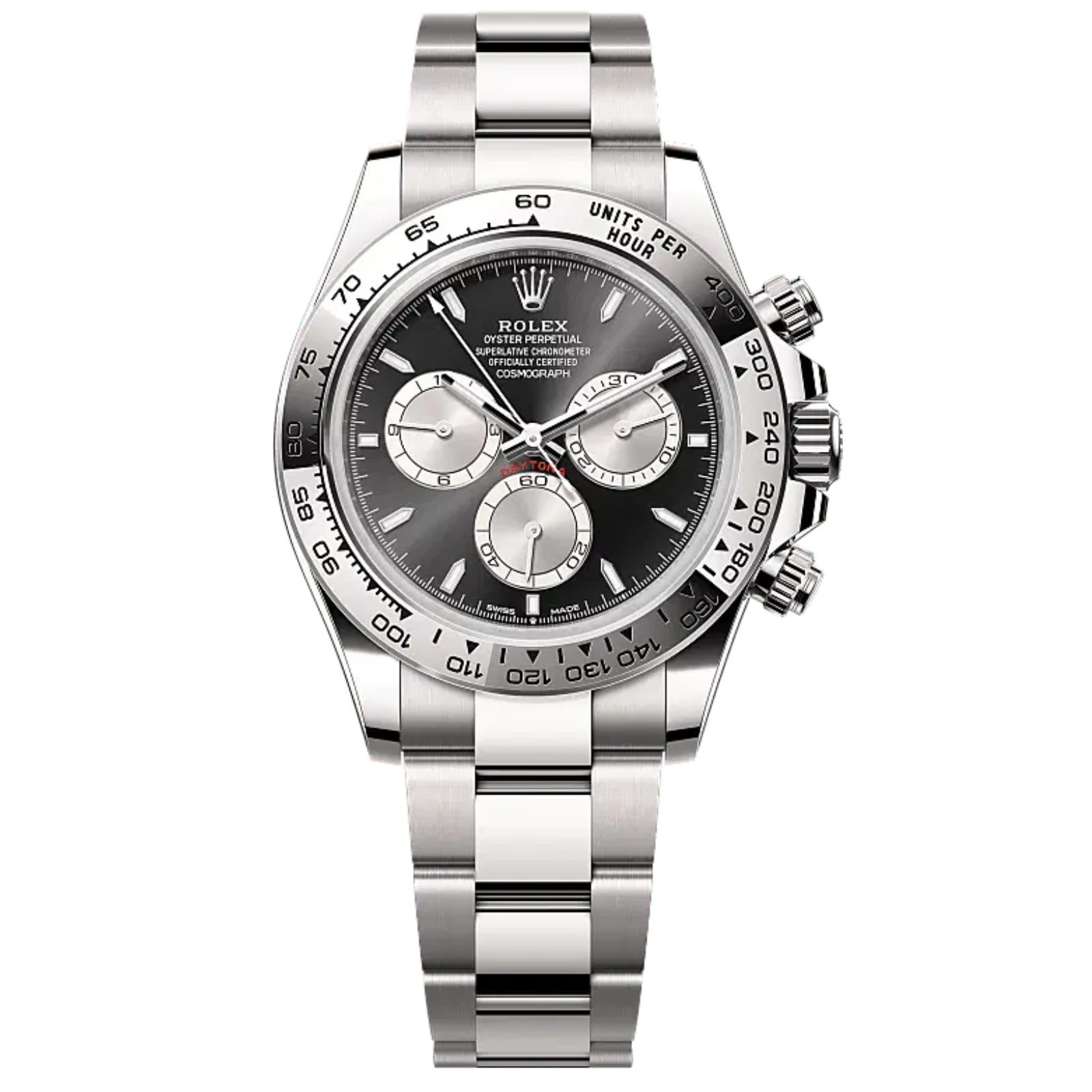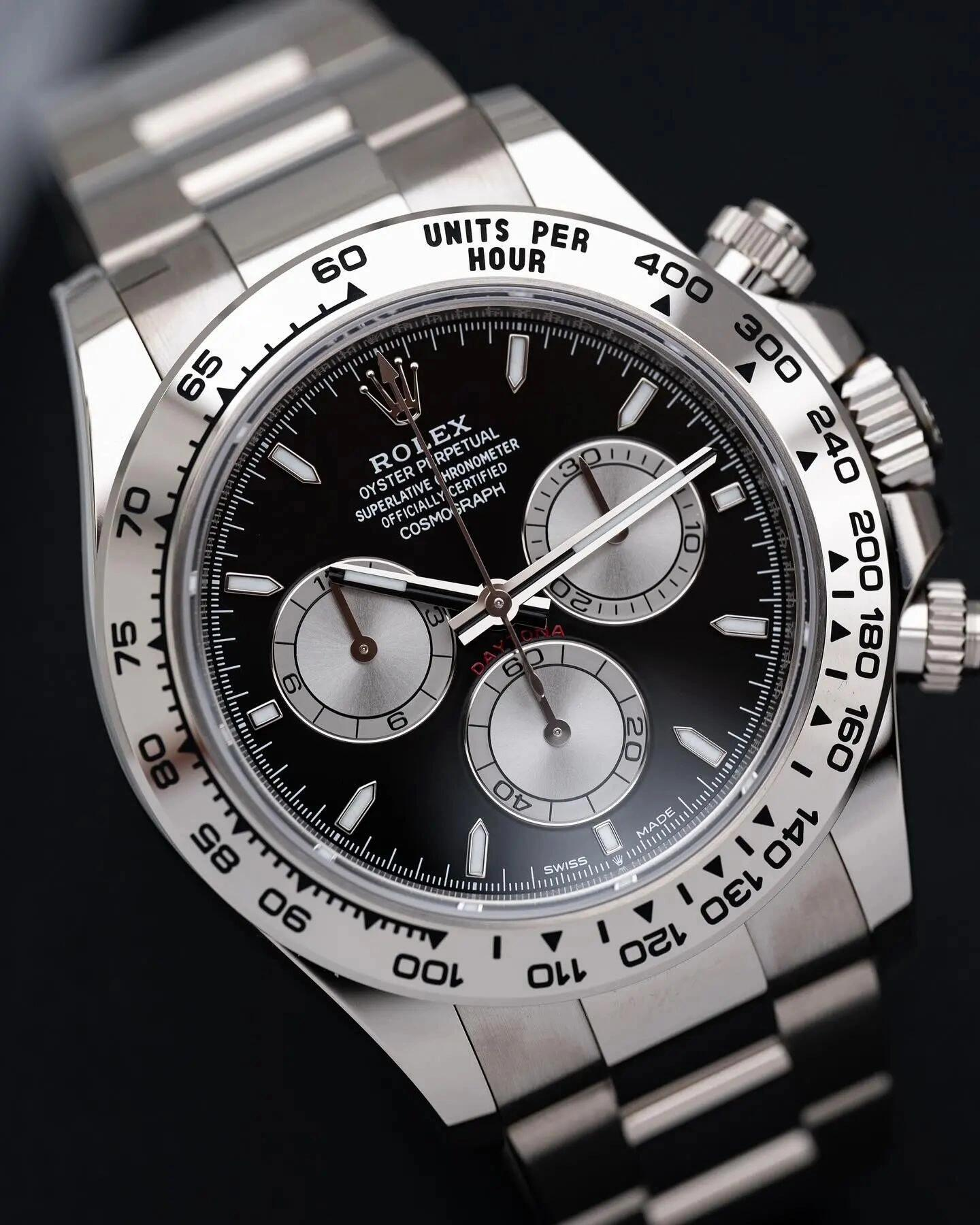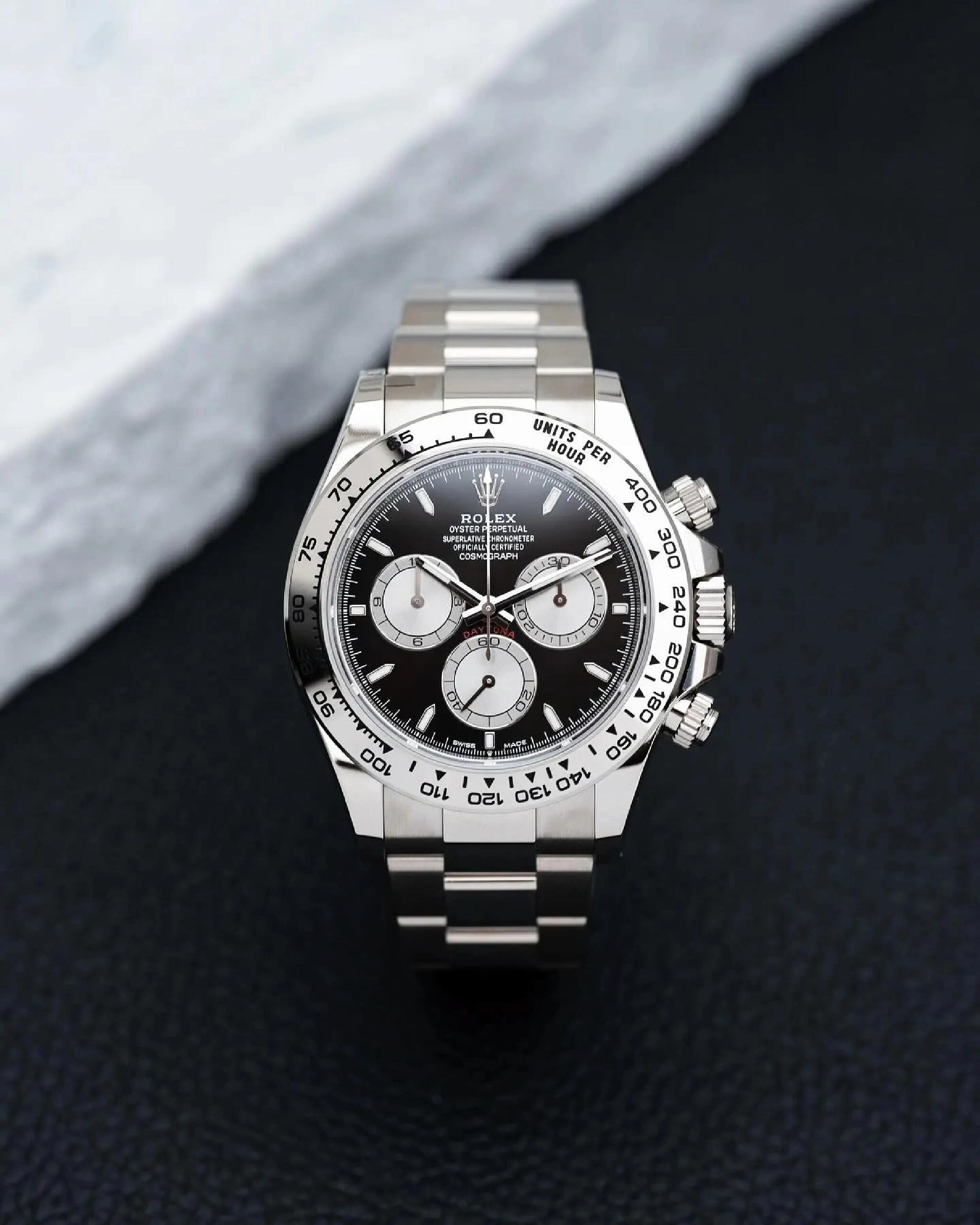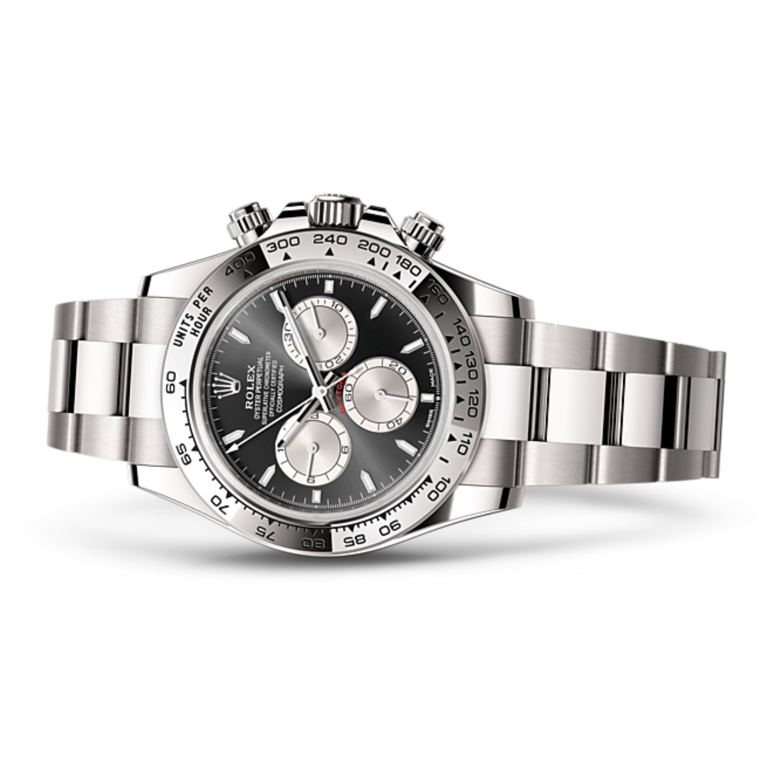 REFERENCE126509 MODEL CASEOyster, 40 mm, white gold BEZELFixed, with engraved tachymetric scale, in 18 ct white gold WATER RESISTANCEWaterproof to 100 metres / 330 feet MOVEMENTPerpetual, mechanical chronograph, self-winding CALIBRE4131, manufacture Rolex POWER RESERVEApproximately 72 hours BRACELETOyster, three-piece solid links DIALBright black and steel CERTIFICATIONSuperlative Chronometer (COSC + Rolex certification after casing) |