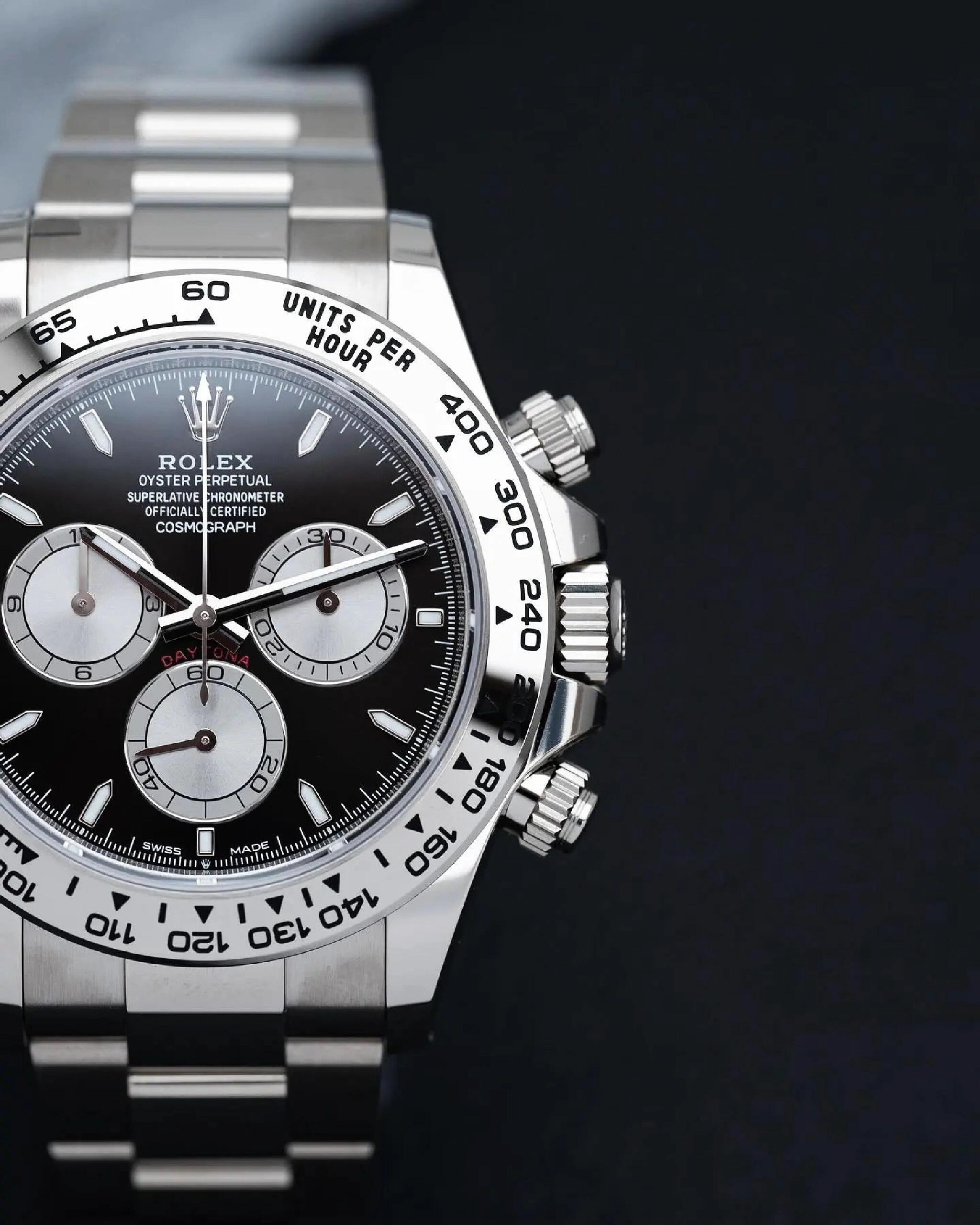 THE TACHYMETRIC SCALEWith its tachymetric scale, its three counters and its pushers, the Cosmograph Daytona was designed to be the ultimate timing tool for endurance racing drivers. The bezel features a tachymetric scale to read average speed over a given distance based on elapsed time. This scale offers optimal legibility, making the Cosmograph Daytona the ideal instrument for measuring speeds up to 400 units per hour, expressed in kilometres or miles. |