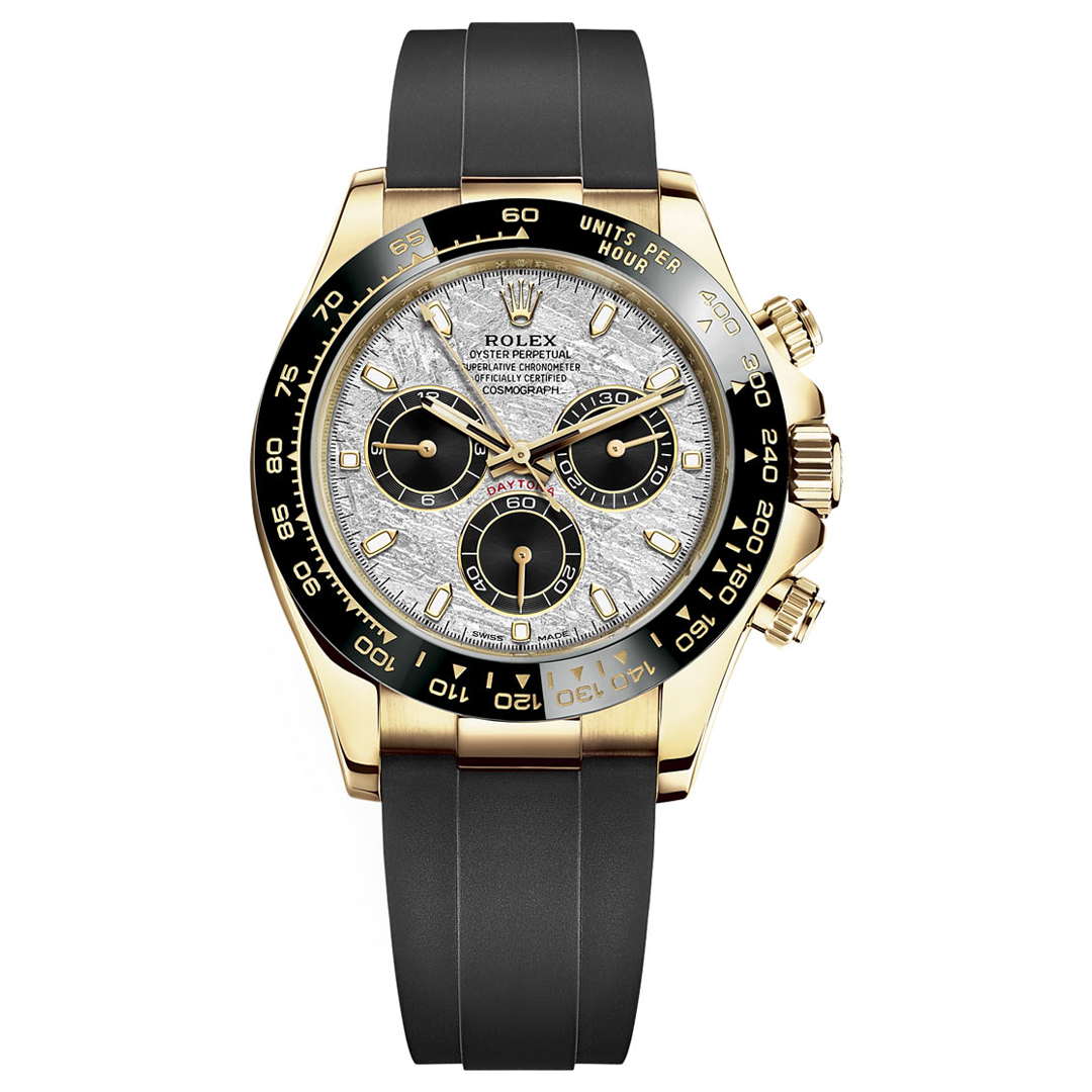 THE OYSTERFLEX BRACELETThe 18 ct gold versions of the Cosmograph Daytona with a Cerachrom bezel are available with an Oysterflex bracelet. Developed by Rolex and patented, it singularly combines the robustness of a metal bracelet with the comfort of an elastomer bracelet. It is made up of two flexible curved metal blades – one in each bracelet section – overmoulded with high-performance black elastomer. For optimum comfort, the Oysterflex bracelet is equipped with cushions on its inner sides and an Oysterlock safety clasp to prevent accidental opening. Its length may be adjusted via the ingenious Rolex Glidelock extension system. |
