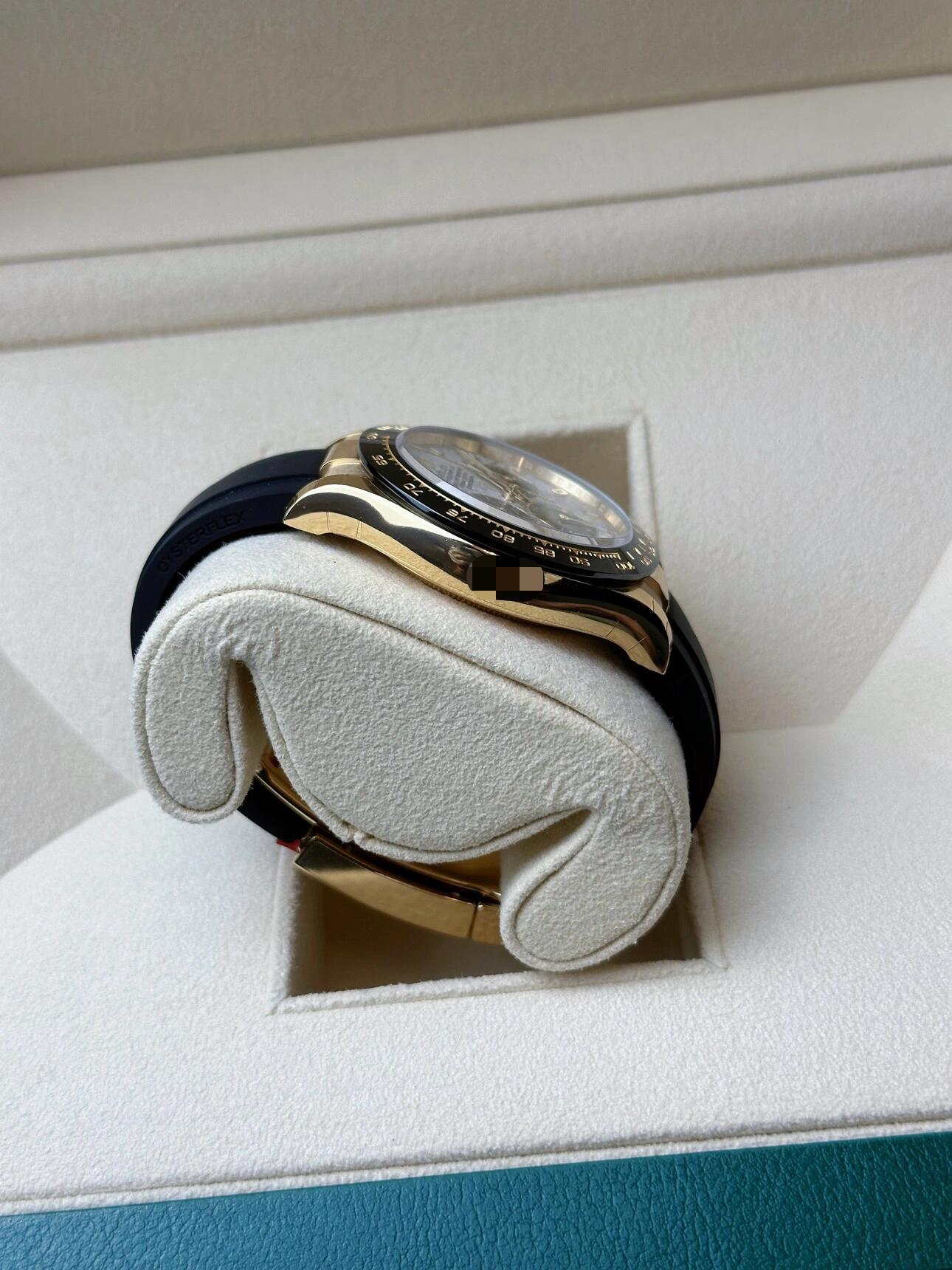REFERENCE126518LN MODEL CASEOyster, 40 mm, yellow gold BEZELBlack monobloc Cerachrom bezel in ceramic with moulded tachymetric scale WATER RESISTANCEWaterproof to 100 metres / 330 feet MOVEMENTPerpetual, mechanical chronograph, self-winding CALIBRE4131, manufacture Rolex POWER RESERVEApproximately 72 hours BRACELETOysterflex DIALGolden and bright black CERTIFICATIONSuperlative Chronometer (COSC + Rolex certification after casing) |