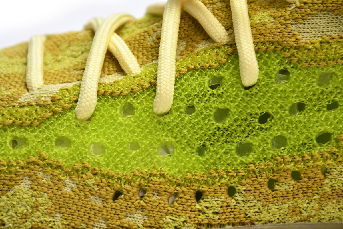 Made using semi-perforated Primeknit material on the upper with a monofilament strip on the lateral side. this Yeezy Boost 380 model has a Boost material interior sole for cushioning.The outer sole is made with rubber and herringbone traction on the bottom. The color palette combines shades of beige. white. grey and a light Hylte green that reflects light.