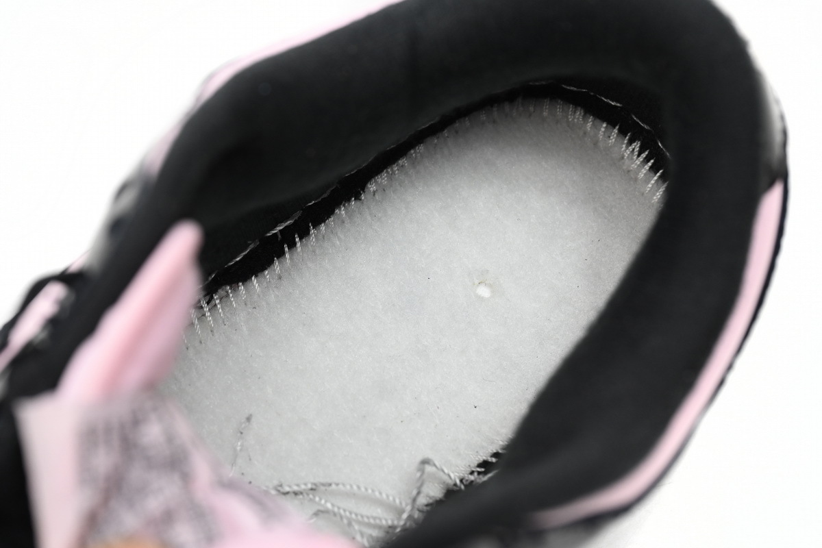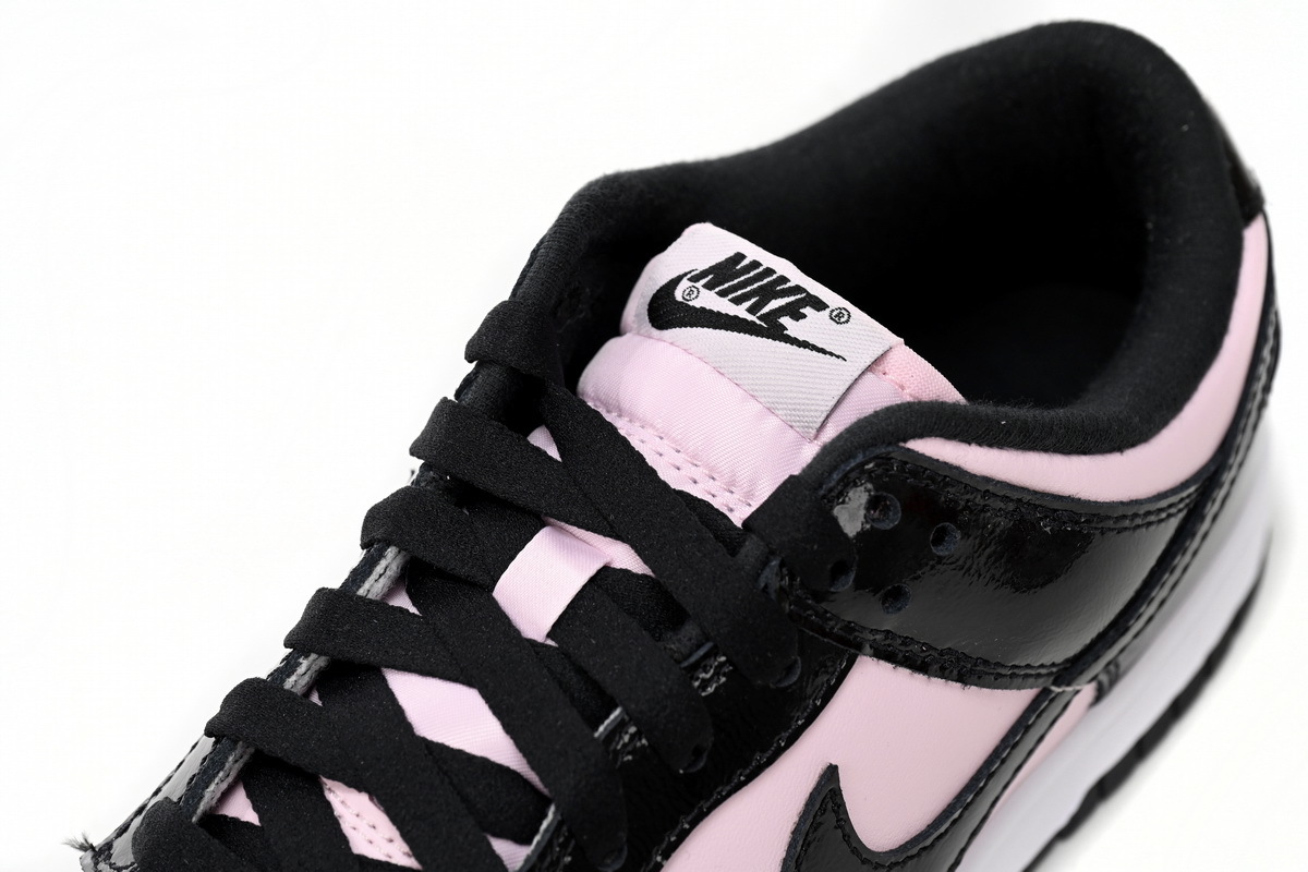 The Nike Dunk Low Pink Foam Black is a low-cut shoe with a black. pink. and white color scheme.
